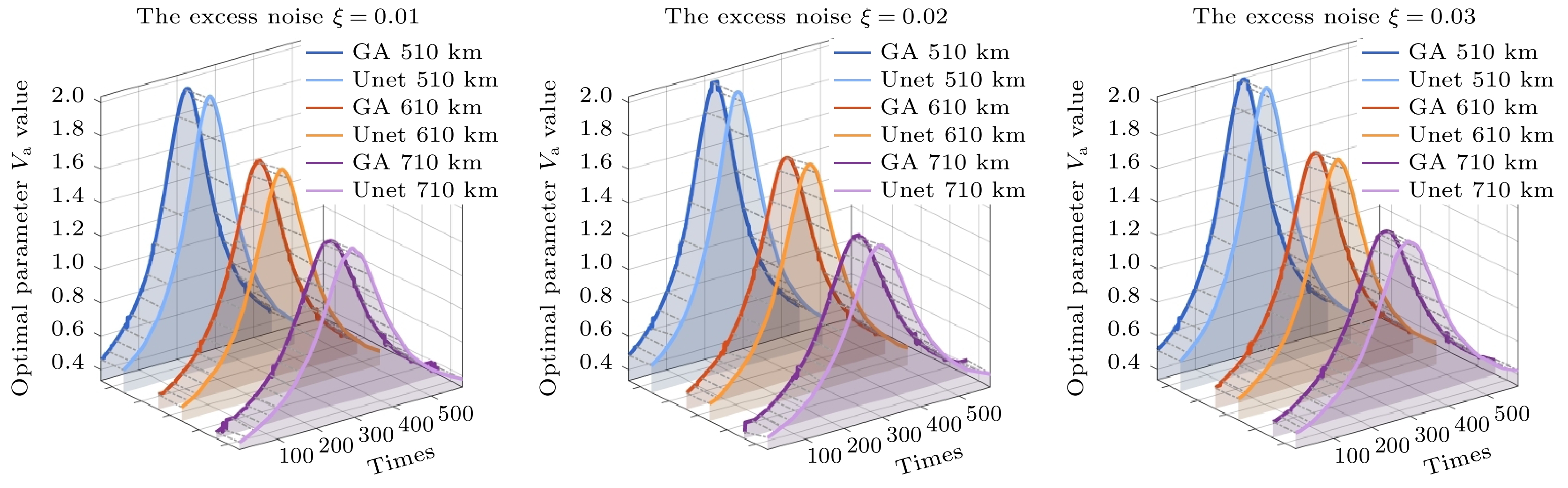 $ {V}_{\mathrm{A}} $ 值的分布情况. 图中横轴表示通信时间, 竖轴表示最优参数$ {V}_{\mathrm{A}} $ 值. GA和Unet预测曲线一致性强, 表明两种方法的结果高度一致可靠. 随着卫星轨道高度从510 km增至710 km, 最优调制方差$ {V}_{{A}_{\mathrm{o}\mathrm{p}\mathrm{t}}} $ 值的分布范围变窄, 在较低的卫星轨道高度下可以实现更宽范围的最优参数. 在过量噪声为0.01时, 最优调制方差从510 km轨道高度的1.80增至1.95; 在过量噪声为0.02和0.03时, 这一趋势也类似.Unet网络不仅能够快速预测最优参数, 而且在不同轨道高度和过量噪声水平下保持高准确率, 为不同条件下的参数估计提供了可靠的解决方案. 随着轨道高度的增加, 最优调制方差