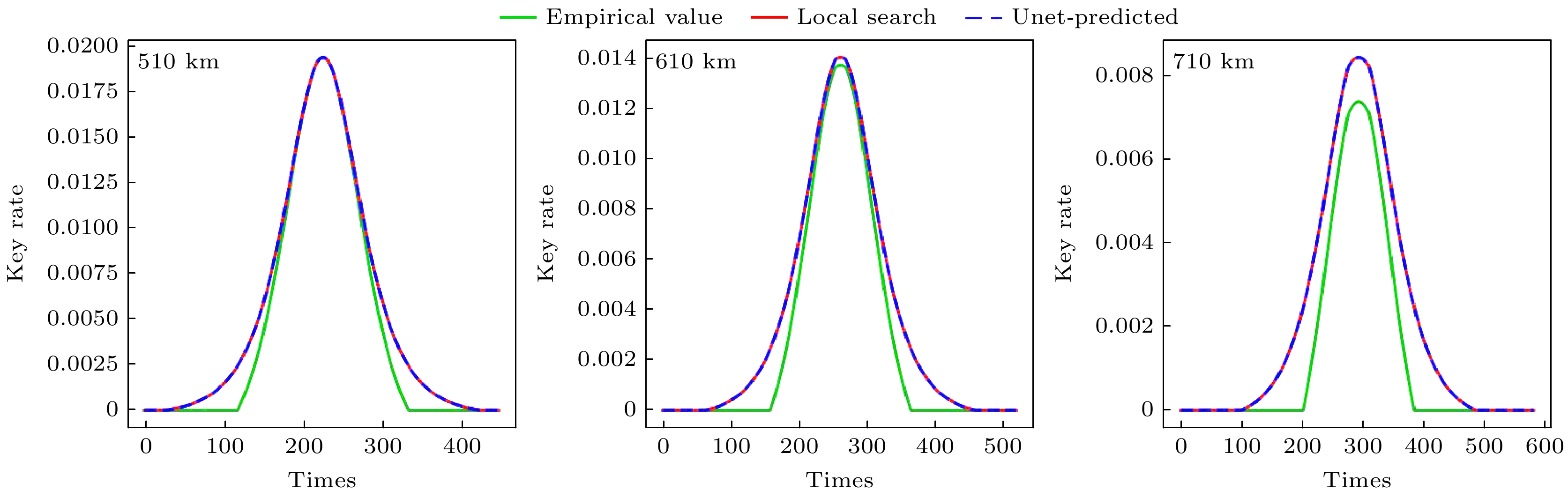 计算效率方面, 在全测试集(6328样本)上, 传统局部搜索方法耗时14754.3 s (约4.1 h), Unet仅需0.16 s, 效率提升达5个数量级. Unet处理时间稳定维持在0.0113—0.0147 s区间, 相较局部搜索算法(1031.4—1330.9 s)实现了4个数量级的加速. 这种毫秒级响应特性使Unet可适配低轨卫星约10 min的过境窗口要求, 为星地CV-QKD系统的动态参数优化提供了实用化解决方案.
