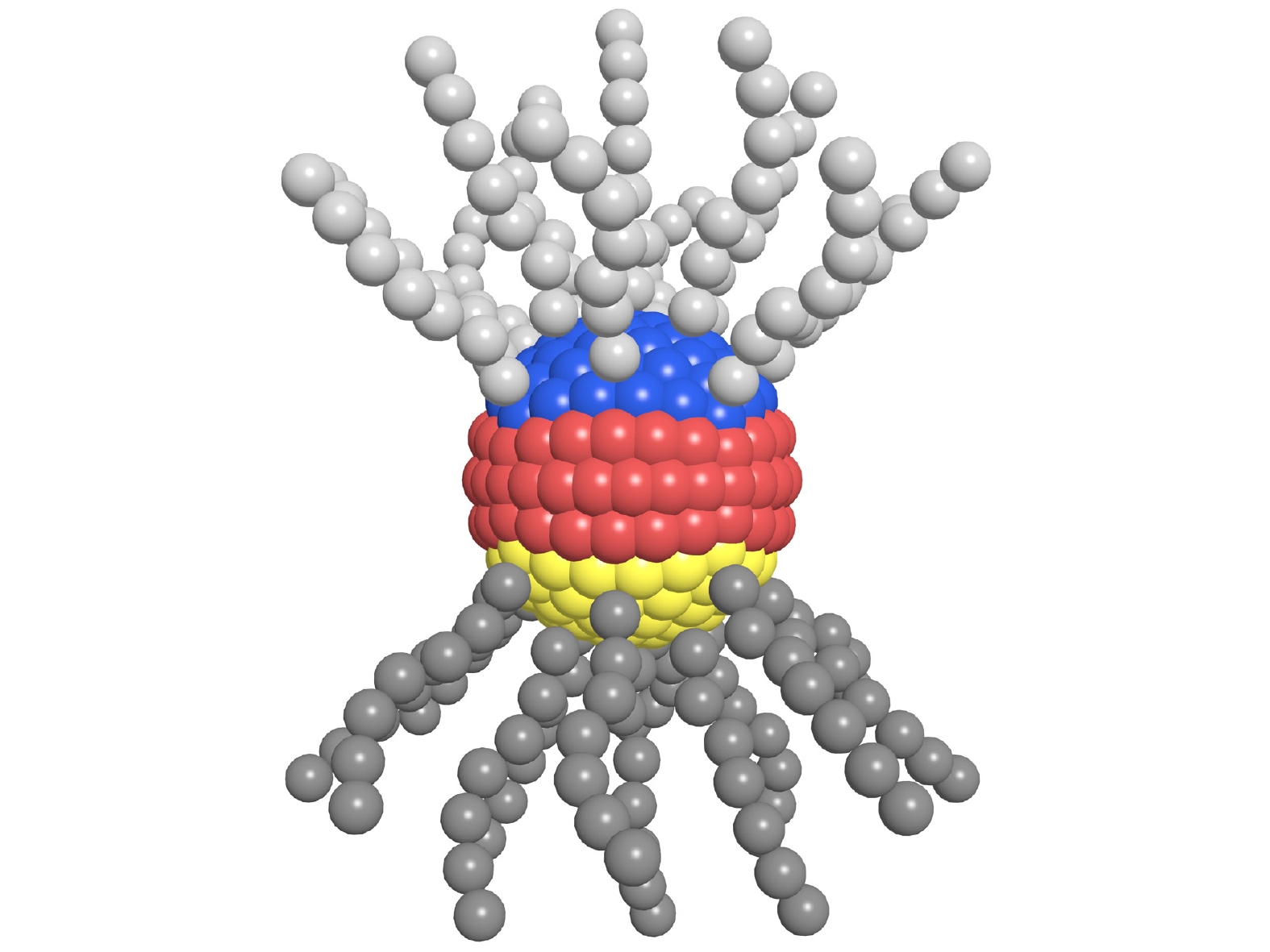 Figure 1. Polymer grafted nanoparticle model. The white and grey segments represent hydrophilic and hydrophobic segments, respectively. The blue and yellow patches correspond to the grafting regions of the hydrophil (C) and hydrophobic (D) chains, respectively, and the red patch corresponds to the non-grafting region.