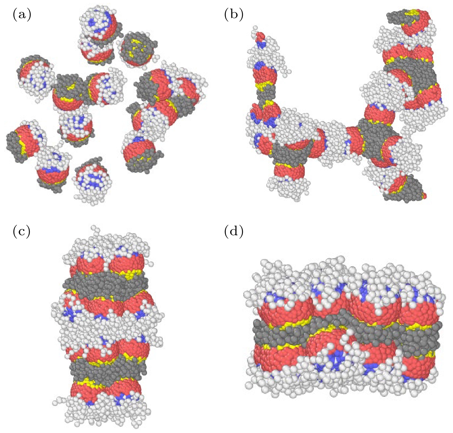 $ {L_{\text{C}}} $ , 接枝数量为$ {N_{\text{C}}} $ ; 灰色粒子D构成的疏水链段, 其长度为$ {L_{\text{D}}} $ , 接枝数量为$ {N_{\text{D}}} $ ; 溶剂粒子S (图1中未显示); 中间的斑块化纳米颗粒基团由直径为1的粒子堆砌而成, 该斑块化纳米颗粒由三部分构成, 即接枝亲水链段的蓝色斑块, 接枝疏水链段的黄色斑块, 以及未接枝链段的红色斑块.在模拟中, 设置模拟盒子的尺寸为