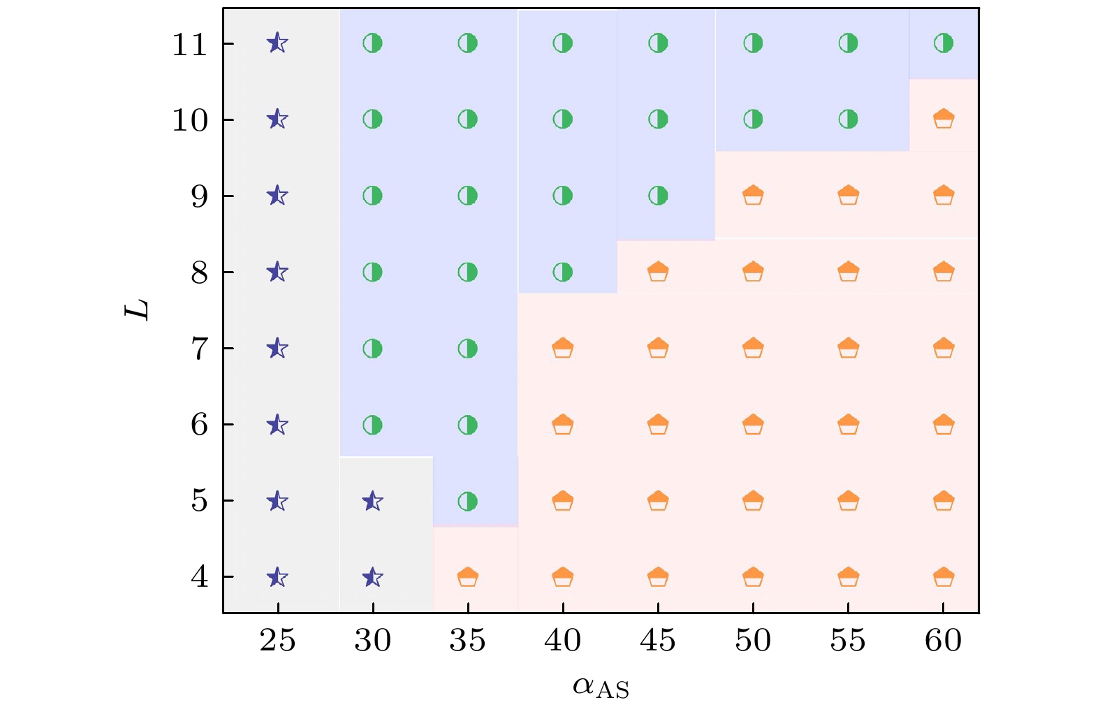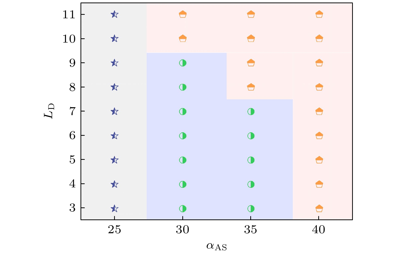 $ {\alpha _{{\text{AS}}}} $ 和链段长度L变化的相图, 其中 代表枝状结构; 代表柱状结构; 代表双层膜结构Figure 3. Phase diagram of flexible patchy copolymer self-assembly structures varying with the parameter of the driving force and the segment length L.