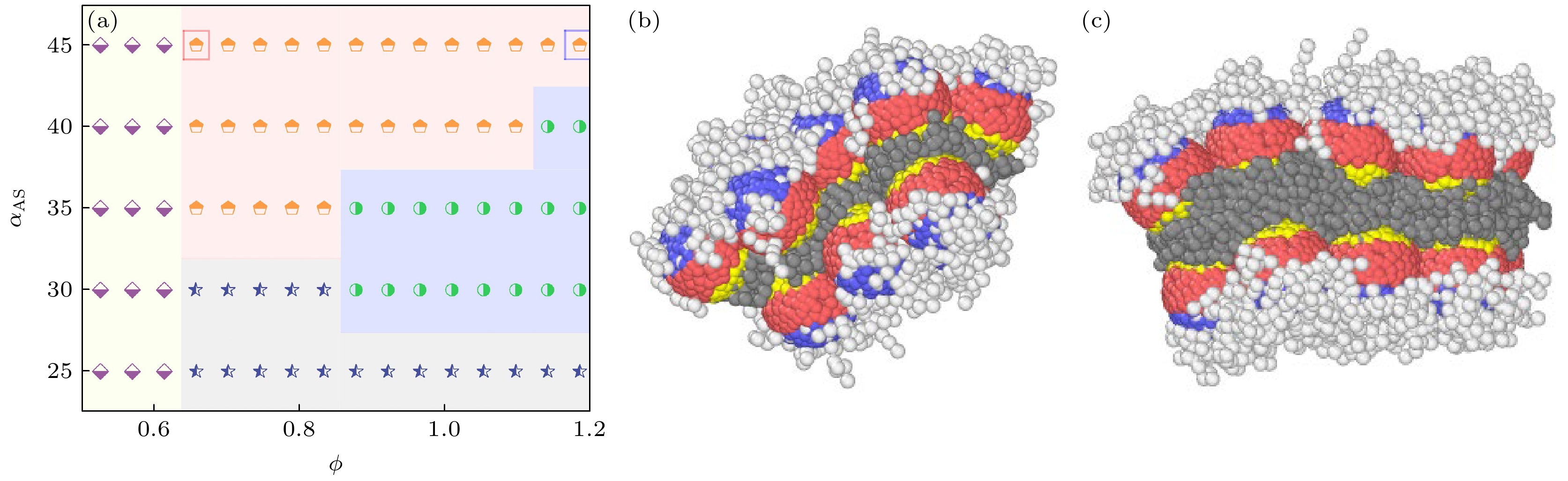 代表离散结构; 代表枝状结构; 代表柱状结构; 代表双层膜结构; (b)$ \varPhi = 0.65 $ ,$ {\alpha _{{\text{AS}}}} = 45 $ 时双层膜结构形貌图; (c)$ \varPhi = 1.18 $ ,$ {\alpha _{{\text{AS}}}} = 45 $ 时双层膜结构形貌图Figure 4. (a) Phase diagram of self-assembled structure of grafted nanoparticles with different grafting density polymers.