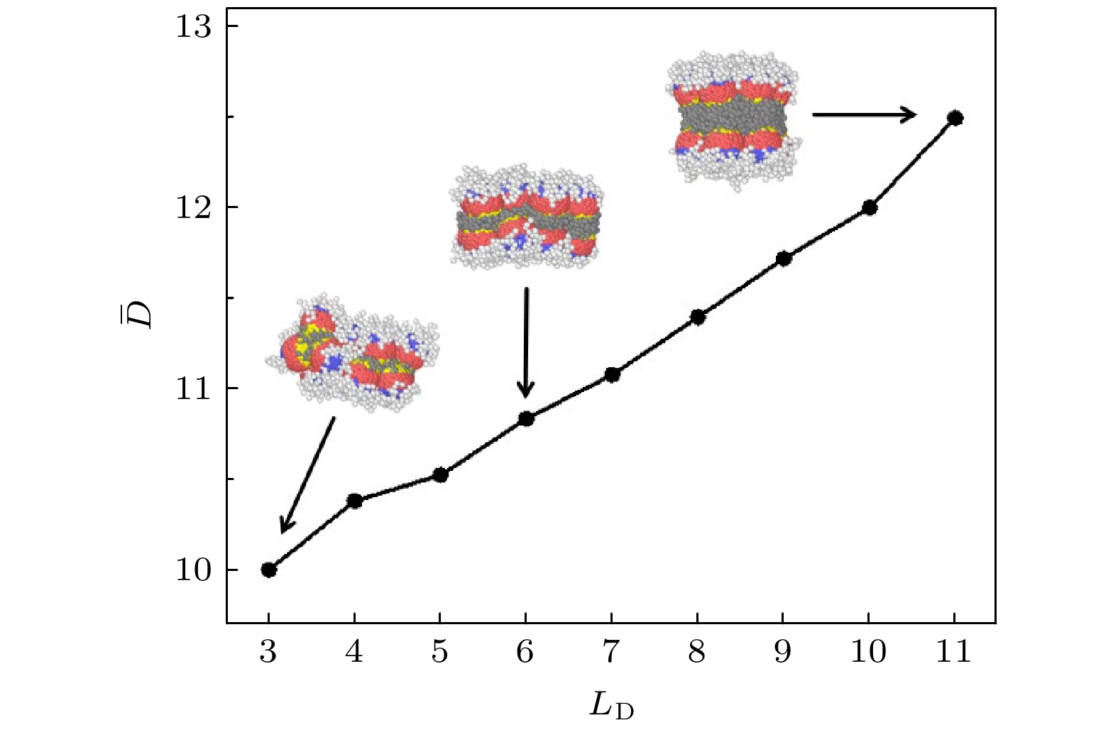 $ {N_{\text{C}}} = {N_{\text{D}}} = 20 $ , 接枝亲水链段长度$ {L_{\text{C}}} = 6 $ , 探讨了不同$ {\alpha _{{\text{AS}}}} $ 条件下, 接枝疏水链段长度$ {L_{\text{D}}} $ 对体系结构形成的影响, 具体结果如图5所示. 从图5可以看出, 当纳米球为亲水性时($ {\alpha _{{\text{AS}}}} = 25 $ ), 溶剂效应较为显著, 无论如何调节疏水链长, 体系结构均呈现枝状结构. 而当纳米球与溶剂之间为强排斥力时($ {\alpha _{{\text{AS}}}} \geqslant 40 $ ), 体系总体呈现出双层膜结构, 疏水链段长度对体系结构的形成几乎没有影响. 而当$ 25 < {\alpha _{{\text{AS}}}} < 40 $ 时, 随着$ {L_{\text{D}}} $ 的增长, 双层膜区域增加, 这一趋势与图3中的结果刚好相反, 为此, 我们统计了当$ {\alpha _{{\text{AS}}}} = 40 $ 时, 体系所形成的双层膜结构的平均膜厚度$ \bar D $ 随疏溶剂链长$ {L_{\text{D}}} $ 的变化, 如图6所示. 从图6可以看出, 疏水链段的增长改变了双层膜结构的平均膜厚度, 随着疏水链段的增加, 平均膜厚度$ \bar D $ 以近似线性增加. 从图6插图还可以看出, 疏水链段长度的增加不仅起到了增加膜厚的作用, 同时还对双层膜的规整度起到了梳理和调节的作用. 体系对应的聚集体形貌结构也在图中相应给出.值得注意的是, 图3—图5中所出现的枝状结构的分枝数还与体系的大小有关. 结果表明: 随着体系的增大(盒子边长增加以及粒子数目的增多), 枝状结构的分枝数总体呈现增加趋势. 但由于枝状结构对于初始条件的敏感性, 体系大小与分枝数之间的定量关系仍有待于进一步研究.