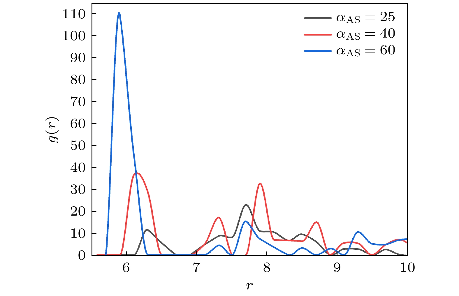 为了定量区分不同的典型自组装结构, 计算了中心粒子的径向分布函数(RDF). RDF的定义为