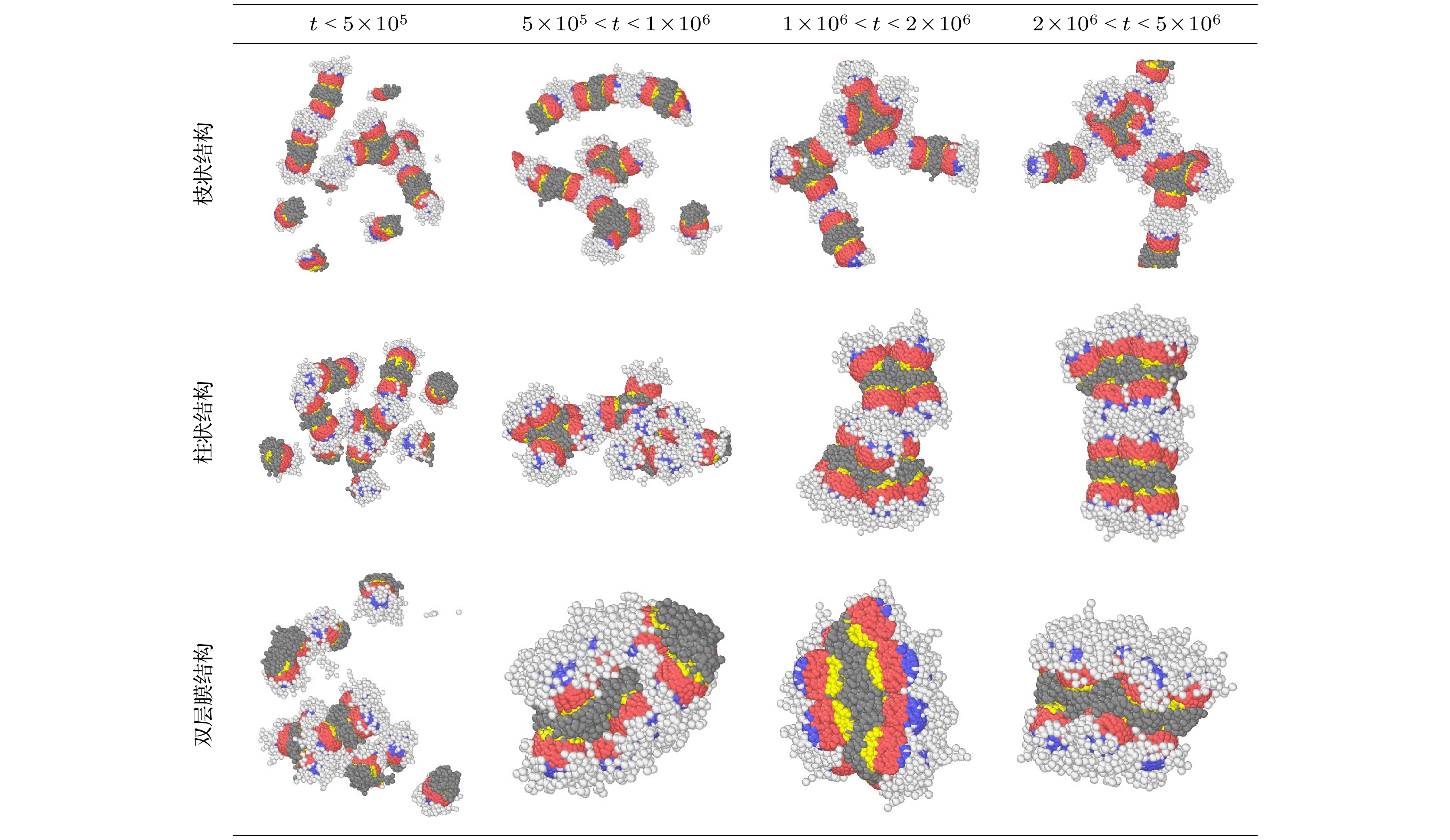 $ g(r) = \dfrac{{{d_n}(r)}}{{4\pi {r^2}\Delta r\rho }} $ , 其中$ {d_n}(r) $ 为壳层体积内从$ r \to r + \Delta r $ 的参考粒子周围的粒子总数平均值,$ \rho = N/V $ 为单位体积的粒子数, V是系统的体积, N是系统中粒子的总数. 我们选取了$ {L_{\text{C}}} = {L_{\text{D}}} = 8 $ , 接枝链数$ {N_{\text{C}}} = {N_{\text{D}}} = 20 $ ,$ {\alpha _{{\text{AS}}}} = 25, {4}0, {6}0 $ 来分别演示枝状结构、柱状结构、双层膜结构. 图7给出了三种典型结构的径向分布函数曲线. 从图7可以看出: 当$ {\alpha _{{\text{AS}}}} = 25 $ 时, 第1个峰对应的值$ g{(r)_{{\text{peak}}}} \approx {11}{.4} $ , 对应的$ {r_{{\text{peak}}}} \approx 6.3 $ ; 而当$ {\alpha _{{\text{AS}}}} = 40 $ 和$ {\alpha _{{\text{AS}}}} = 60 $ 时, 第1个峰对应的值$ g{(r)_{{\text{peak}}}} $ 分别约为36.9和109.4, 对应的rpeak约为6.1和5.9. 由此可见, 随着$ {\alpha _{{\text{AS}}}} $ 的增加, 第1个峰对应的峰值$ g{(r)_{{\text{peak}}}} $ 逐渐增大而对应的rpeak逐渐向原点移动, rpeak值越小, 表明粒子排列越紧密,$ g{(r)_{{\text{peak}}}} $ 值越大, 组装结构越向内收缩. 第2个峰和第1个峰相比, 柱状结构和层状结构的差值较大, 说明体系整体结构趋于收缩; 而枝状结构两个峰值g(r)peak大致相等, 说明体系结构趋于分散. 其次从峰的数目上来看, 双层膜结构的峰的数目最少, 说明了所有粒子均限制在双层膜内; 而柱状结构次之, 说明对应了体系的多层结构; 而枝状结构呈现出多个低峰值, 对应其松散的堆积特性. 从峰的宽度上来看, 峰宽反映了粒子间距离分布的离散程度. 从图7观察到, 枝状结构对应的径向分布函数峰宽最大, 表明该结构中粒子间距离存在较大波动, 分布较为不均匀. 相比之下, 柱状结构和双层膜结构的峰宽度较小, 较小的峰宽度则表明粒子间距离较为均匀, 分布更为集中.为深入探究体系结构形成的动力学机制, 我们追踪分析了三种典型结构的演变路径, 图8给出了体系结构随时间的演化形貌图. 对于枝状结构, 体系在形成过程中经历了由分散的短棒状结构到带状结构再到枝状结构的转变, 该过程主要受接枝链间相互吸引力的驱动; 对于柱状结构, 体系受接枝链间作用力与溶剂相互作用的协同调控, 经历了由短棒状结构到多面体结构再到团簇结构, 最终变为柱状结构的过程; 对于双层膜结构, 在形成过程中经历了先由短棒状变为团簇结构, 并且后续经历了较长一段时间的内部结构重组与弛豫阶段, 最终变为双层膜结构. 这一漫长的结构调整过程是接枝链之间的吸引作用和纳米球-溶剂间相互作用以及“位阻”效应这三者协同作用的结果.