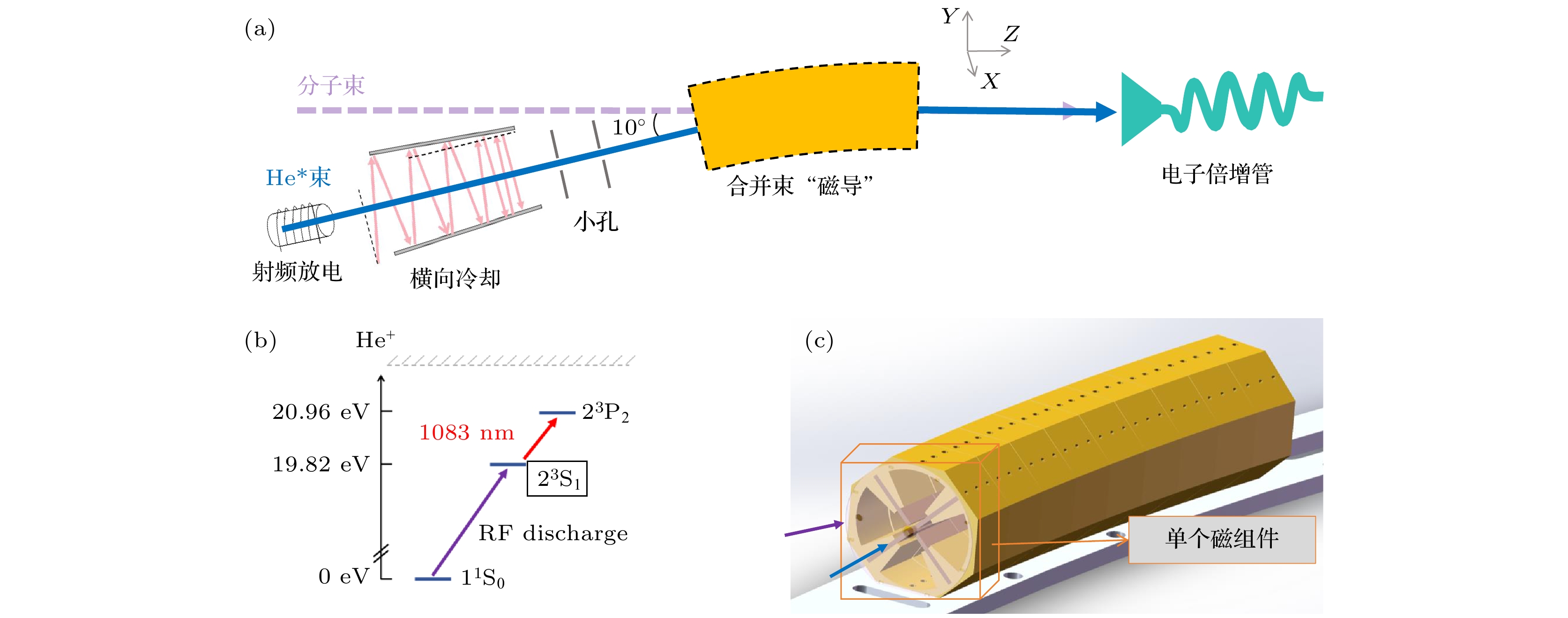 • 图 1  (a) 亚稳态氦原子束线平台示意图. 黑色虚线框内为合并束的永磁体“磁导”装置; (b) 氦原子能级结构图; (c) 磁导三维图