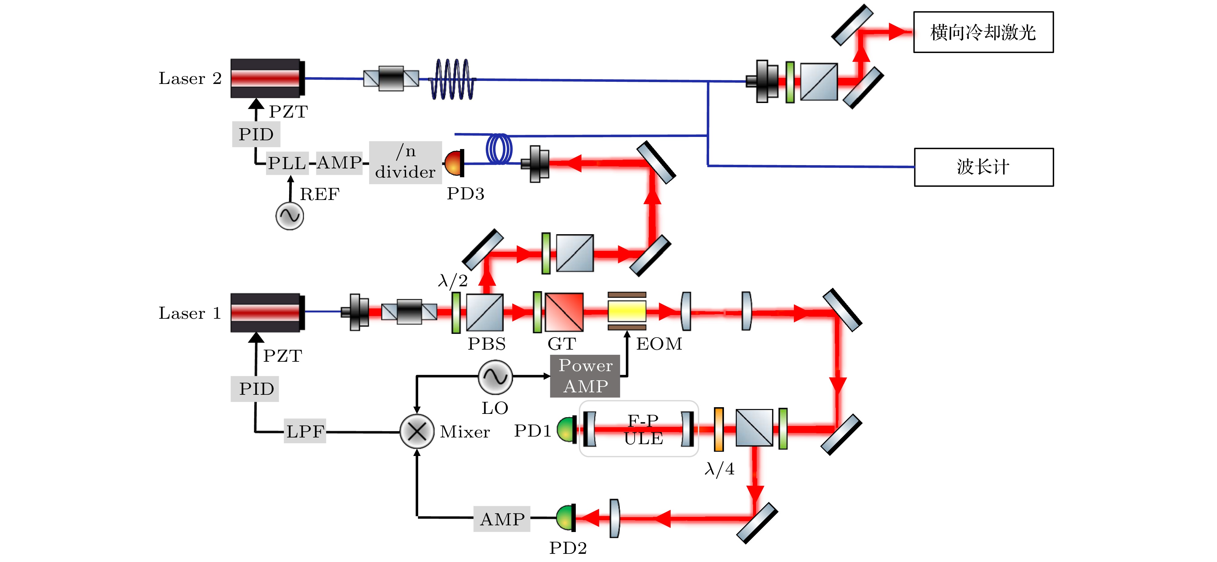 实验的激光系统部分主要由两个独立的光纤激光器光源组成, 如图2所示, 其中Laser 1为参考激光, Laser 2为二维横向冷却光. 两路激光通过锁相环(phase-lock loop, PLL)锁定激光的频率和相位, 激光频率通过Bristol 671A波长计测量确定. 激光器为上海频准激光公司的窄线宽光纤激光器, 输出激光标称线宽<10 kHz, 激光器的压电陶瓷PZT慢调制范围达10 GHz, 且带宽为5 kHz. 实验通过Pound Drever Hall(PDH)稳频技术将Laser 1锁定于法布里-珀罗(Fabry-Perot, F-P)超稳腔的模式上作为参考激光, F-P腔主要由超低膨胀系数(ultra-low expansion, ULE)玻璃和两个高反射平凹反射镜组成. 通过比例-积分-微分(proportion integration differentiation, PID)反馈的温控电路保持F-P腔的温度稳定, 提高锁频的稳定性. 横向冷却激光Laser 2和参考激光Laser 1通过高速光电探测器PD3得到拍频信号, 拍频信号通过除法器后放大进入负反馈的PLL和PID反馈电路, 将拍频信号锁定到参考信号源REF. 由此实现冷却光与参考激光的频率和相位的锁定, 使两个激光间的频率差保持相对稳定, 保证了横向冷却激光的频率稳定性. 横向冷却光最后通过镀高透膜的法兰窗进入真空源腔, 并在腔内安装的反射镜间多次反射, 形成横向冷却区.