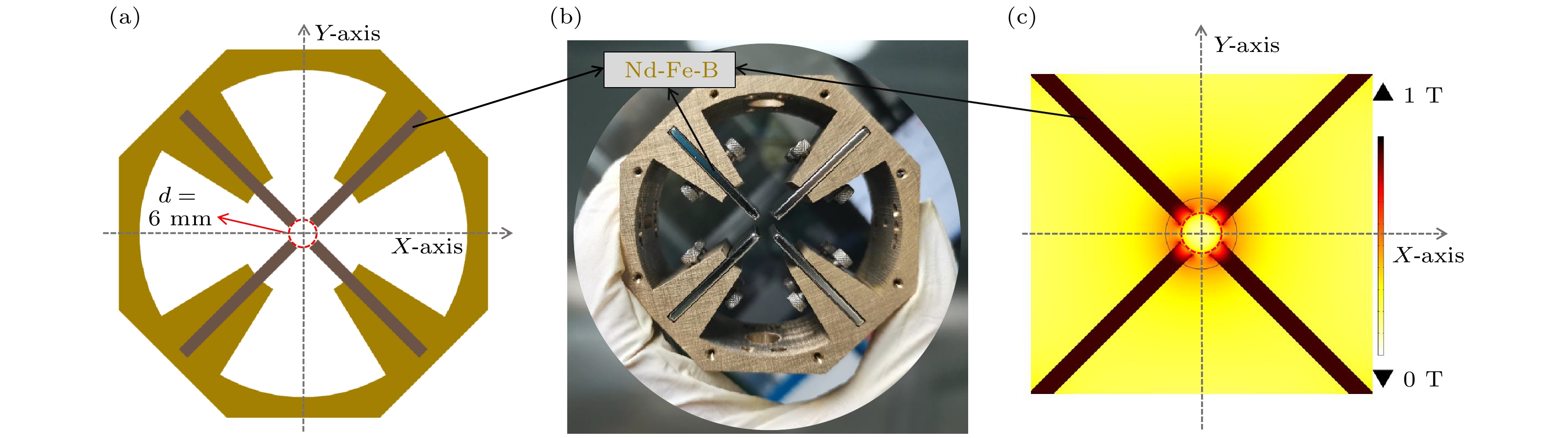 • 开展毫开尔文量级极低能量氦原子与分子合并束冷碰撞的关键实验基础是实验室内实现单一量子态中性氦原子偏转且与分子束共线碰撞. 本实验中, 射频放电激发制备的亚稳态氦原子经磁导(图1(c))传输后, 不仅实现原子磁子能级的分离与选态, 同时使偏转后的单量子态氦束与分子束共线传输. 图3(a)图3(b)显示了组成磁导的单个磁组件结构, 永磁体磁导由10个磁组件结构两两间隔约1°紧密装配而成如图1(c)中黄色的弧形结构所示. 每个磁组件由四个磁钢组成, 磁钢为N52钕铁硼Nd-Fe-B烧结永磁体, 磁体相互夹角为90°. Nd-Fe-B永磁材料易被氧化和腐蚀, 导致磁性衰减, 为提高磁钢的耐腐蚀性, 本实验采用镀镍+铜+镍的电镀方式进行防腐蚀处理. 氦原子在磁组件中心形成的直径6 mm空隙中传输, 如图3(a)红色圆环标记所示. 分子束则可以通过两个磁钢间的间隙传输. 磁组件中心的XY平面磁场分布如图3(c)所示(X方向为水平方向, Y为竖直方向, Z轴为垂纸面方向), 红色圆环内部为不均匀的磁场分布, 圆心位置是磁势的最低点, 随着离中心圆点距离增加, 磁场越强, 靠近磁钢表面的磁场最高. 磁场分布的模拟结果由有限元分析方法计算获得, 模拟中未考虑杂散磁场以及周围装配件引入的磁场变化. 实验中为尽可能减小磁钢装配件和固定件对磁场分布的影响, 磁钢以外的加工件均采用铜材质和铝合金材质.