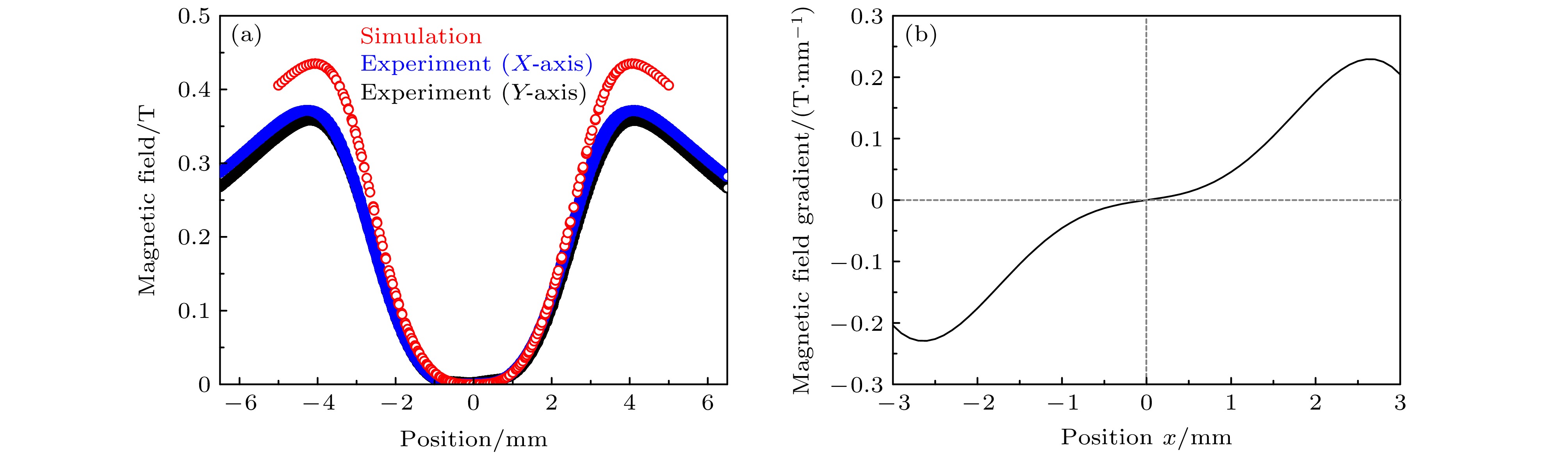 基于原子与磁场作用的塞曼效应, 不均匀磁场内运动的氦原子受磁场力的不同会导致不同磁子能级氦原子的飞行轨迹被改变. 由此, 为了更仔细地理解原子在磁导内部的运动, 本文开展了氦原子在XZ平面的二维运动轨迹分析. 图4(a)为单个磁组件的一维径向磁场分布, 其中红色空心圆为有限元计算的结果, 蓝色和黑色标记的磁场分布曲线分别为XY轴磁感应强度的实验测量值. 实验采用Senis MMS-1A-RS磁场成像测绘系统对磁组件的磁场分布大小进行了测量, 磁场测量的空间分辨率达1 μm, 测量精度优于0.1%. 在正负3 mm范围内, 磁场的实验测量结果和模拟结果符合较好, 其中实验和模拟之间存在的磁场偏差主要来自于磁钢加工的精度、磁偏角及装配过程中存在误差等.