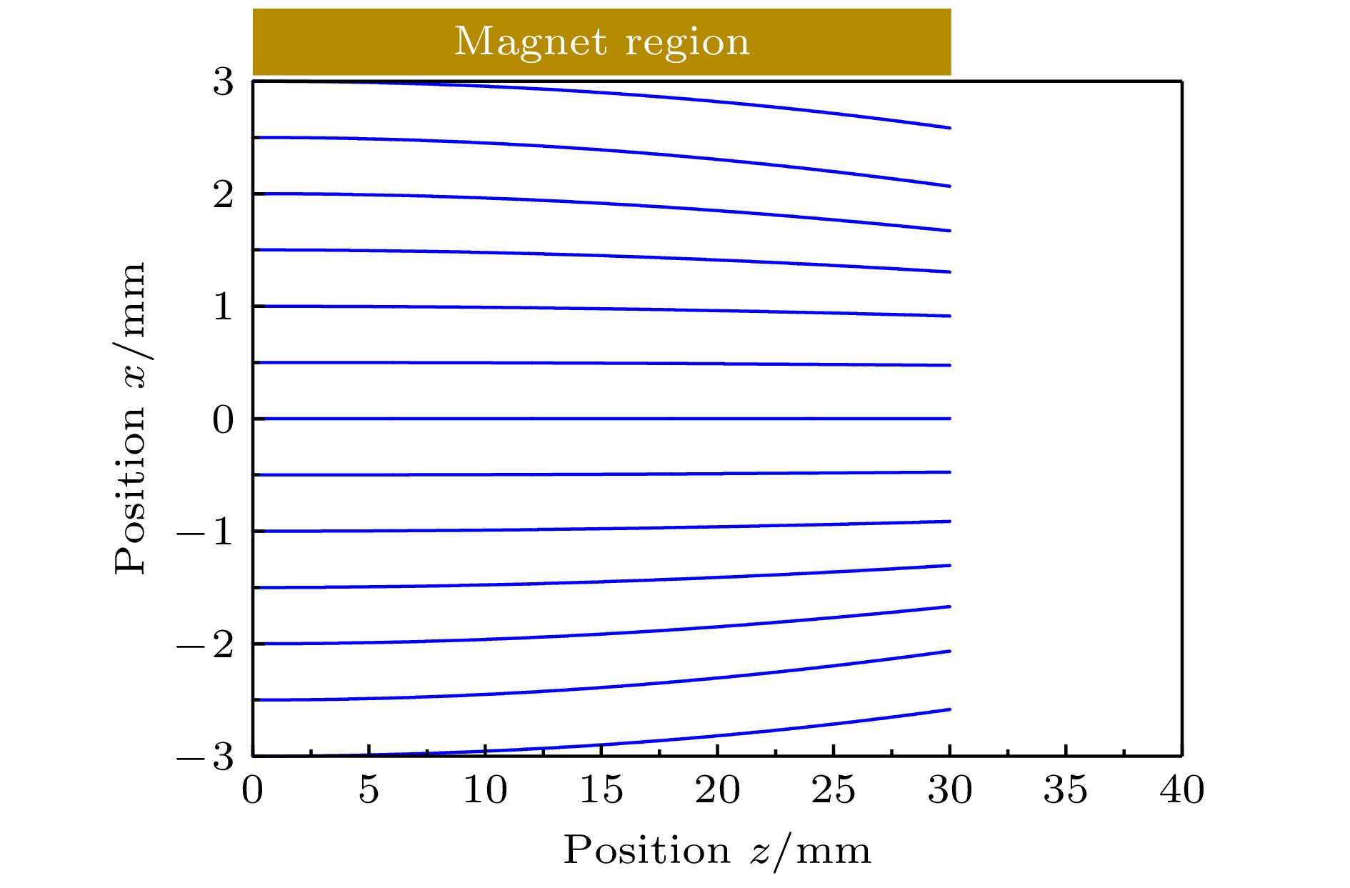 结合上述磁场分布和(2)式, 图5计算得到了800 m/s的$ {M_J} = + 1 $磁子能级23S1 He*原子在磁组件内的运动轨迹. 从图5可以看出, 单个磁组件对垂直进入磁导中心空隙的$ {M_J} = + 1 $磁子能级的23S1亚稳态氦原子有显著的聚焦效果. 这也表明, $ {M_J} = - 1 $的亚稳态氦原子将表现出相反的运动特征, 即磁导对于$ {M_J} = - 1 $氦原子具有发散效果. $ {M_J} = 0 $的亚稳态氦原子由于受磁场力为零, 在磁组件内将不受影响, 继续沿着初始方向飞行. 本文模拟800 m/s氦原子传输是因为液氮冷却后氦束速度约为800 m/s的原子占比较多, 与脉冲阀产生的超声速氢分子束速度相近(脉冲阀冷泵降温至约40 K), 速度相近的合并束碰撞有利于开展更低碰撞能的低温反应实验.