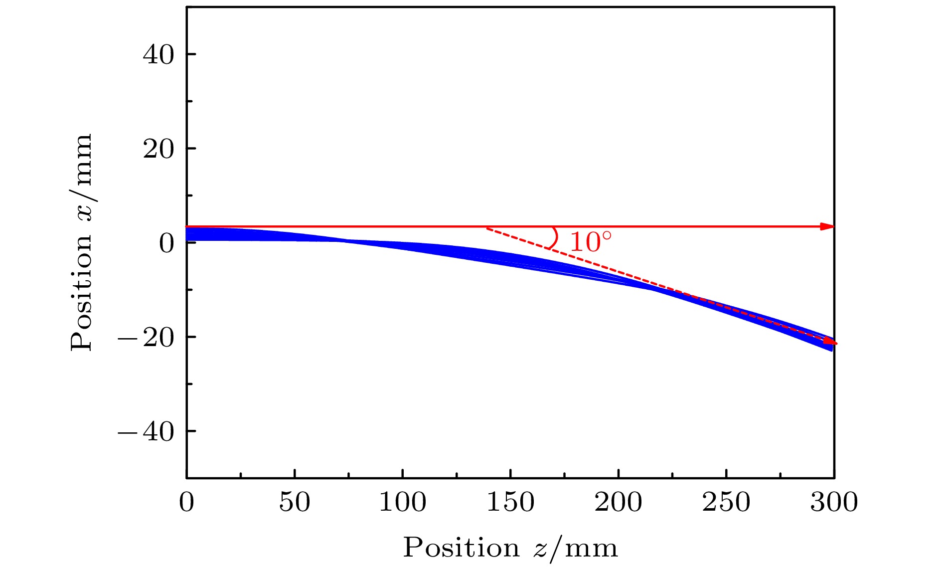 图 6  800 m/s的$ {M_J} = + 1 $磁子能级亚稳态氦原子穿过磁导的运动轨迹模拟