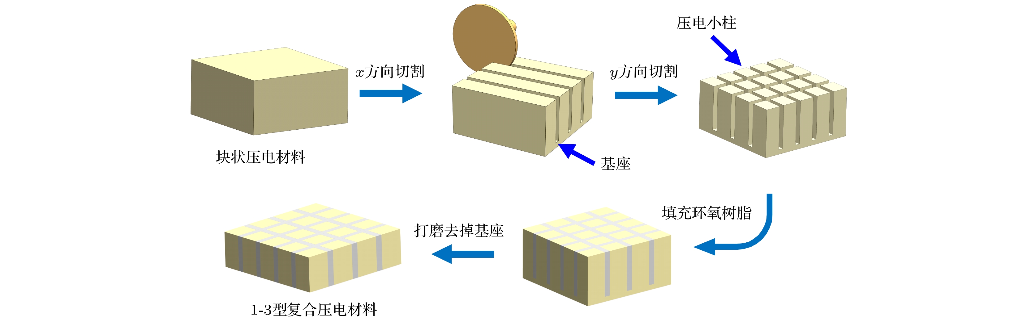 • 使用精密划片切割机(DS616, 沈阳和研科技有限公司)对块状压电材料沿x方向进行阵列切割, 保留基座厚度0.2 mm, 灌注Al2O3颗粒改性E51环氧树脂并固化后, 沿与x方向垂直的y方向进行二次切割, 再次灌注Al2O3粉改性E51环氧树脂并固化后, 打磨去掉基座, 漏出压电小柱, 获得1-3型压电复合材料. 复合材料的压电相体积分数会影响机电耦合系数[16], 通过有限元仿真确定压电相体积分数约为0.55时, 机电耦合系数达到最优值. 对1-3型压电复合材料上下表面打磨抛光, 随后上下表面进行喷金处理, 具体步骤如图1所示.