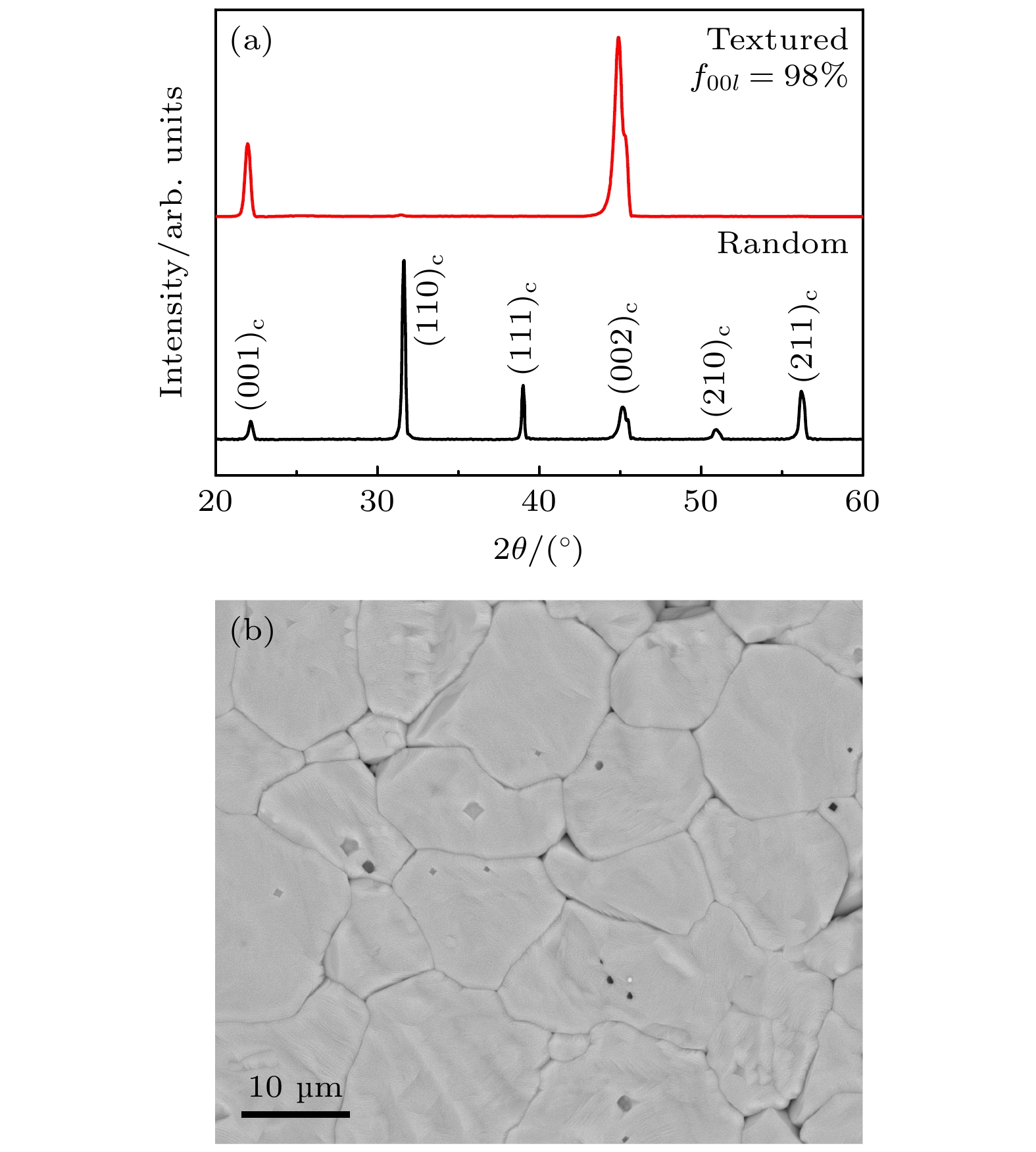 • 图3(a)所示为无取向BCZT陶瓷及织构BCZT陶瓷的XRD图. 从图3可以看出, 无取向和织构陶瓷均为纯相的钙钛矿型结构, 在XRD检测精度内没有发现第2相. 无取向BCZT陶瓷XRD谱的最强衍射峰为(110)C峰, 而织构陶瓷则表现出显著的(001)C择优取向特征, 其(001)C和(002)C衍射峰较强, 非{001}C峰很弱. 采用Lotgering因子法[19]计算织构度f00l为98%, 表明织构晶粒沿[001]C方向高度定向排列. 图3(b)所示为织构陶瓷的微观形貌. 织构陶瓷内部晶粒排布较为致密, ImageJ软件计算其平均晶粒尺寸约为11 μm. 织构晶粒内部没有观测到BT模板的存在, 这与织构生长过程中BT模板的逐渐消融有关. 该现象与文献[14]报道的模板诱导织构化的形成机制一致.