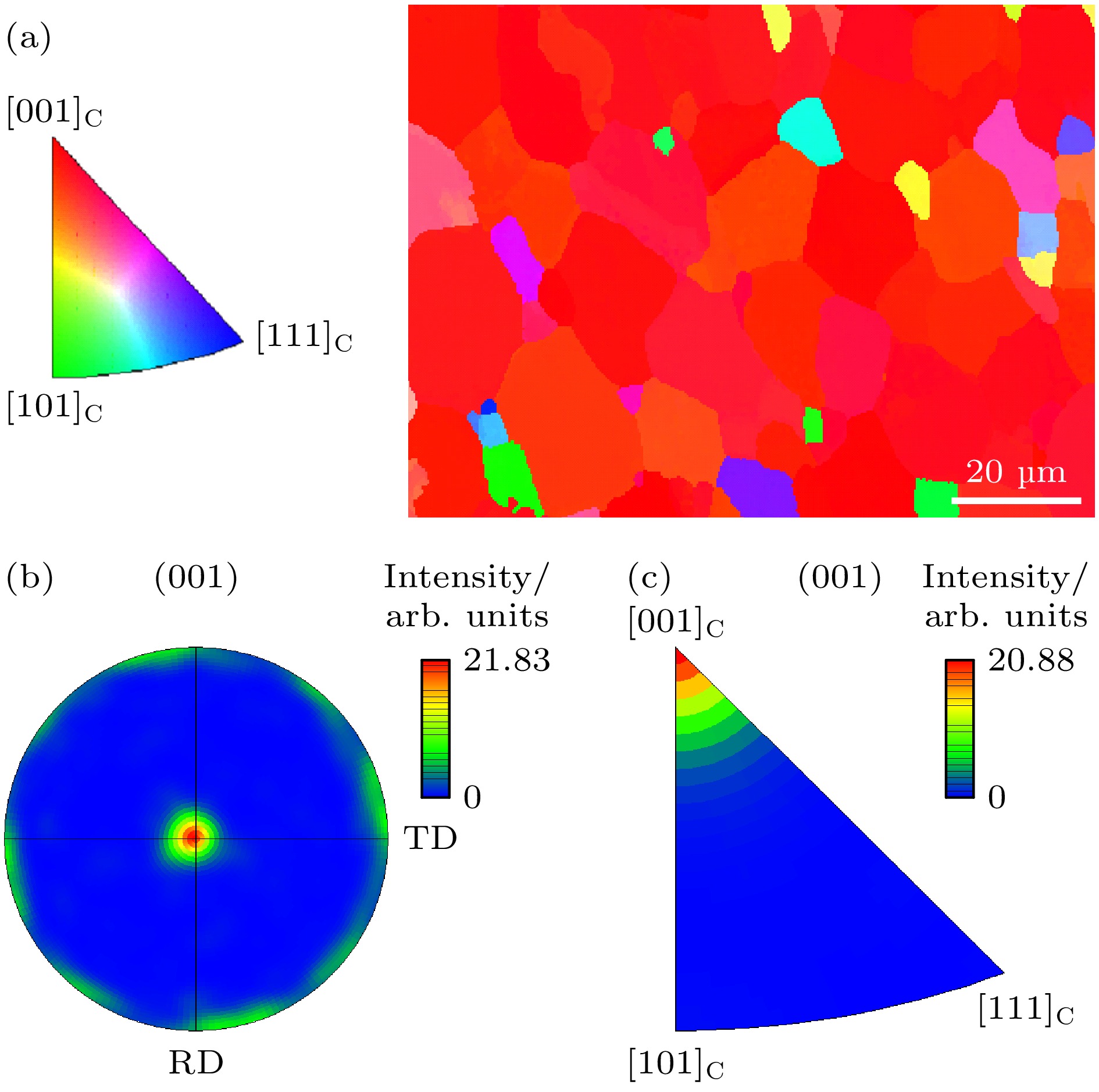 Figure 4.  (a) EBSD map, (b) (001) pole figure, and (c) (001) inverse pole figure of the textured BCZT ceramic.