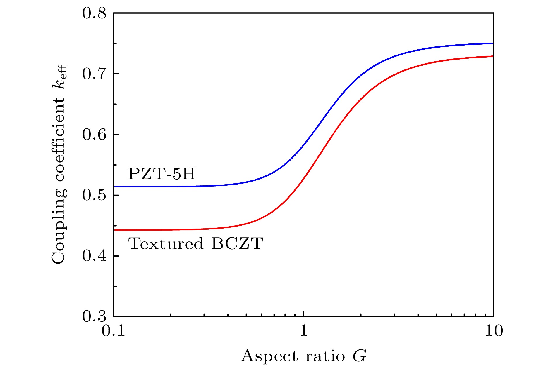 基于上述理论模型及材料参数, 通过数值计算绘制了织构BCTZ及PZT-5H陶瓷有效机电耦合系数keff随长径比G (0.1 < G < 10)的变化曲线(图6). 两种材料全矩阵参数采用表3表4数据. 结果表明, 当G ~ 0.1, 织构BCTZ和PZT-5H压电振子的有效机电耦合系数keff均达到最小, 对应的kt值分别为0.44 (BCTZ)和0.51 (PZT-5H). 随着长径比G的增大, 两种材料的keff呈现单调递增趋势, 最终趋于饱和状态, 对应的k33值分别为0.73 (BCTZ)和0.75 (PZT-5H), 此结果验证了机电耦合系数计算模型的可靠性. 值得注意的是, 当G增大到4时, 两种材料的有效机电耦合系数keff分别为0.71 (BCTZ)和0.74 (PZT-5H), 基本趋近于k33, 且相对于k33值均小于3%.