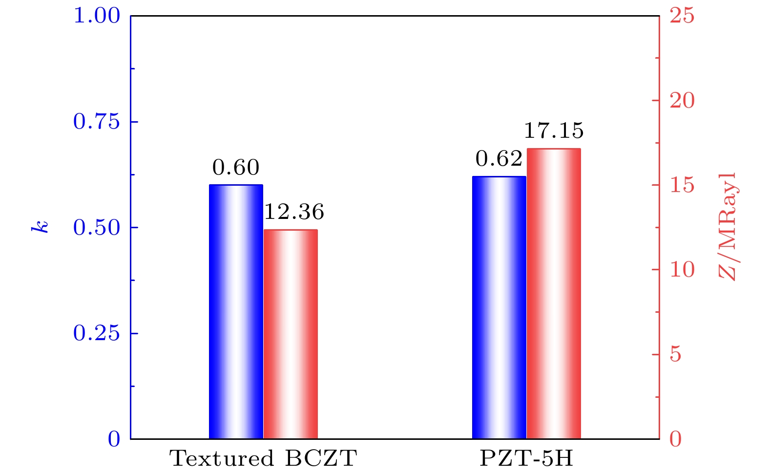 表4对比了织构BCZT陶瓷与商用PZT-5H陶瓷的压电常数和介电常数. 织构BCZT陶瓷表现出显著的压电性能, 其纵向压电系数d33为605 pC/N, 高于PZT-5H陶瓷的593 pC/N, 而且压电电压常数g33为23.6×10–3 V·m–1·Pa–1, 较PZT-5H陶瓷19.7×10–3 V·m–1·Pa–1提升20%, 这意味着采用织构BCZT陶瓷的压电超声换能器在接收灵敏度方面可能超越PZT-5H. 这里需要注意的是, 表4中压电系数是采用共振法测得, 其数值通常略小于准静态d33测量仪测得数据, 主要原因是准静态法使用近似表达的公式${d_{33}} = {{{D_3}A}}/({{{T_3}A}}) = {Q}/{F}$, 其精确的理论表达式应为${d_{33}} = ({{{D_3}A - \varepsilon _{{33}}^{\text{T}}E{}_3 A}})/({{{T_3}A}}) = ({{Q - \varepsilon _{{33}}^{\text{T}}E{}_3 A}})/{F}$, 式中A为面积, D3为电位移, T3为应力, Q为电荷, F为力. 实际操作中, 因为电场强度E3难以测量且数值相对很小, 所以忽略了含E3的微扰项, 导致准静态法测试压电系数值偏高. 在介电性能方面, 织构BCZT陶瓷的自由介电常数$\varepsilon _{{33}}^{\text{S}}$为1341, 较PZT-5H ($\varepsilon _{{33}}^{\text{S}}$~1434)降低6%, 较低的介电常数有助于减小电容, 加快驱动信号响应速度, 这意味着织构BCZT陶瓷在高频换能器应用中的损耗将更小, 其较低的介电常数有助于减小电容, 加快响应速度. 在机电耦合性能方面, 织构BCZT陶瓷厚度振动模式耦合系数kt为0.44, 较PZT-5H降低16%, 但其纵向耦合系数k33为0.73, 与PZT-5H的0.75基本持平, 表明织构BCZT陶瓷在纵向振动模式下具有优异机电转换效率. 综上, 织构BCZT陶瓷展现出的压电性能可比拟于PZT-5H, 同时实现介电常数、压电电压常数优化. 其高g33、低$\varepsilon _{{33}}^{\text{S}}$特性在宽频带、高灵敏度超声换能器的设计中展现出独特优势, 具有替代铅基陶瓷的巨大潜力.