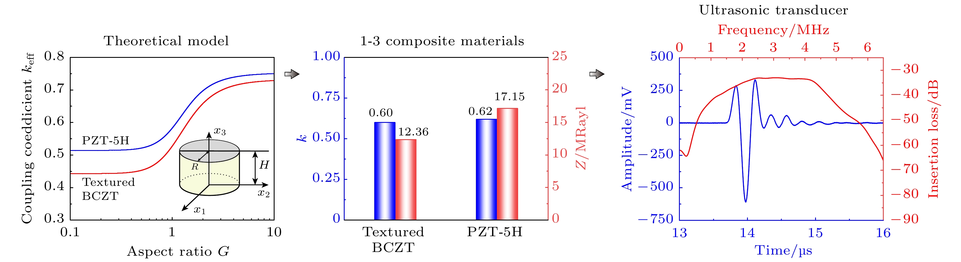 针对上述问题, 本文基于沿[001]C高度择优取向的织构BCZT陶瓷(织构度f00l ~ 98%), 采用谐振-反谐振法(共振法)结合脉冲回波超声测量技术, 首次构建了包含介电常数、压电常数、弹性常数和机电耦合系数等在内的织构BCZT陶瓷全矩阵机电参数数据库. 随后, 基于压电本构方程建立了k关于长径比G的理论模型, 阐明几何形貌对机电耦合系数的影响规律. 最终基于此模型设计并制备1-3型BCZT/环氧树脂复合材料换能器, 并与1-3型PZT-5H换能器进行对比. 结果表明, 织构BCZT超声换能器在中心频率(~3 MHz)附近的–6 dB带宽提升至107.1%, 远优于文献报道的PZT-5H超声换能器. 本研究为无铅压电材料的器件化应用提供了完整的参数体系与可靠的材料支撑, 对推动绿色超声诊断技术发展具有重要意义.