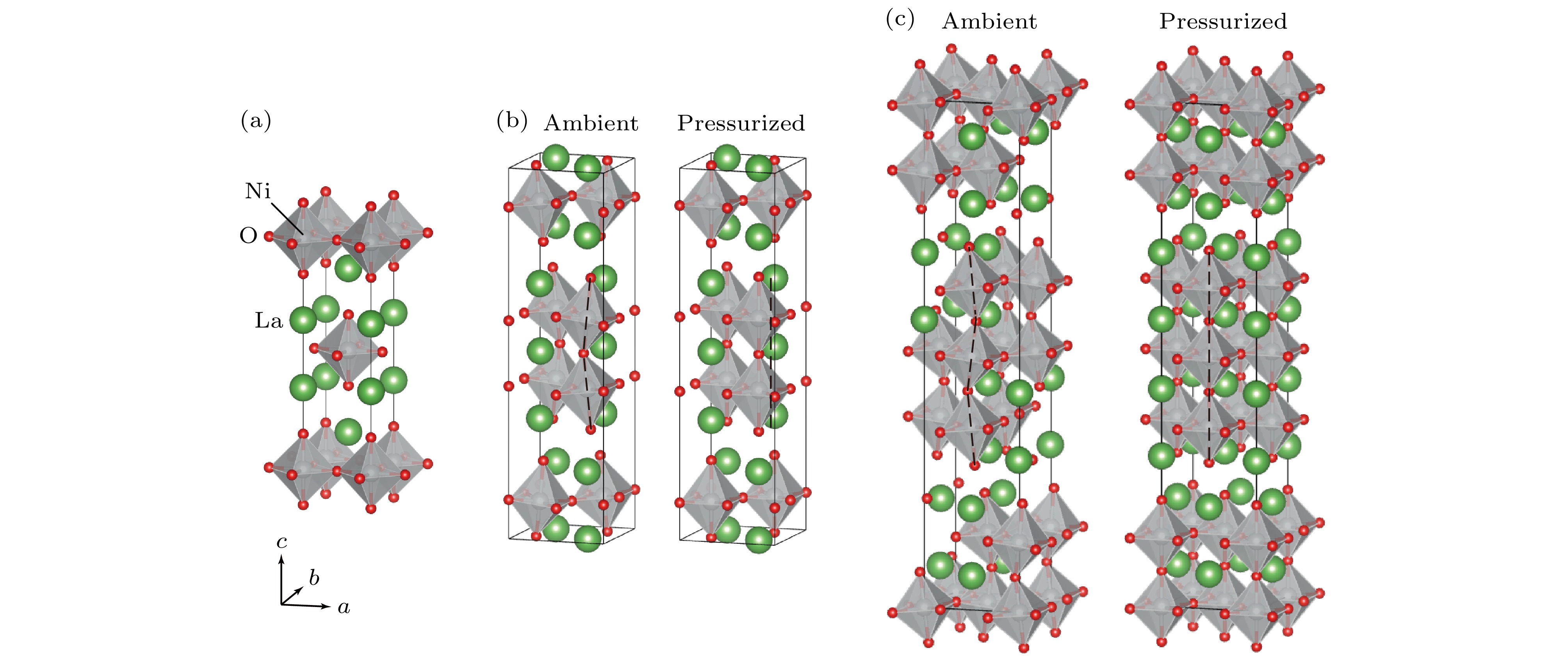 Figure 1. Crystal structures of R-P phase layered nickelate oxides at the ambient and high pressure: (a) Monolayer La2NiO4; (b) bilayer La3Ni2O7; (c) trilayer La4Ni3O10; the green, gray and red spheres represent La, Ni, and O atoms, respectively, the black dashed lines indicate the distortion of the Ni—O octahedra along the c direction in the bilayer and trilayer systems.
