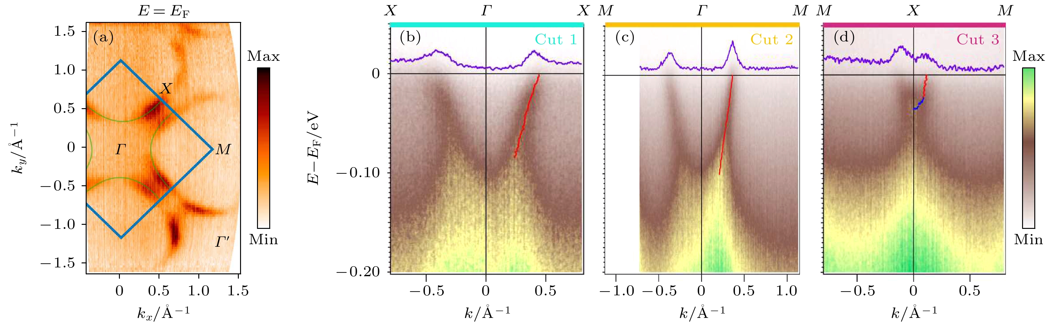 图 10 (a) Pr4Ni3O8的费米面, 图中强调了以布里渊区角落为中心的空穴口袋; (b)—(d) 在温度T = 22 K测量的高对称方向的色散, 紫色线条代表费米能位置处的MDCs, 从MDCs的峰值位置(红点)提取的能带色散重叠在图中[216]