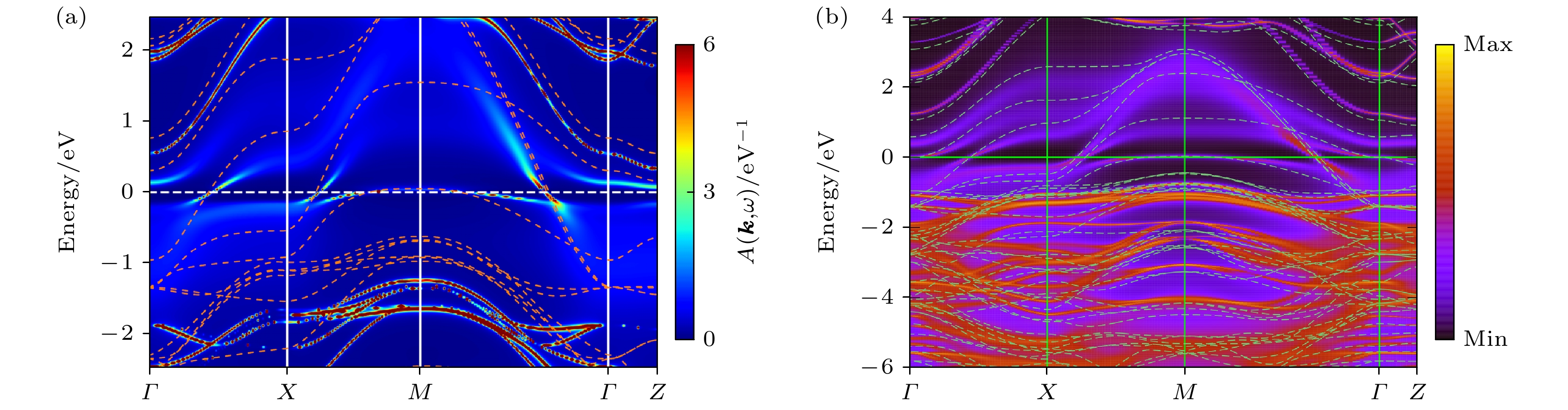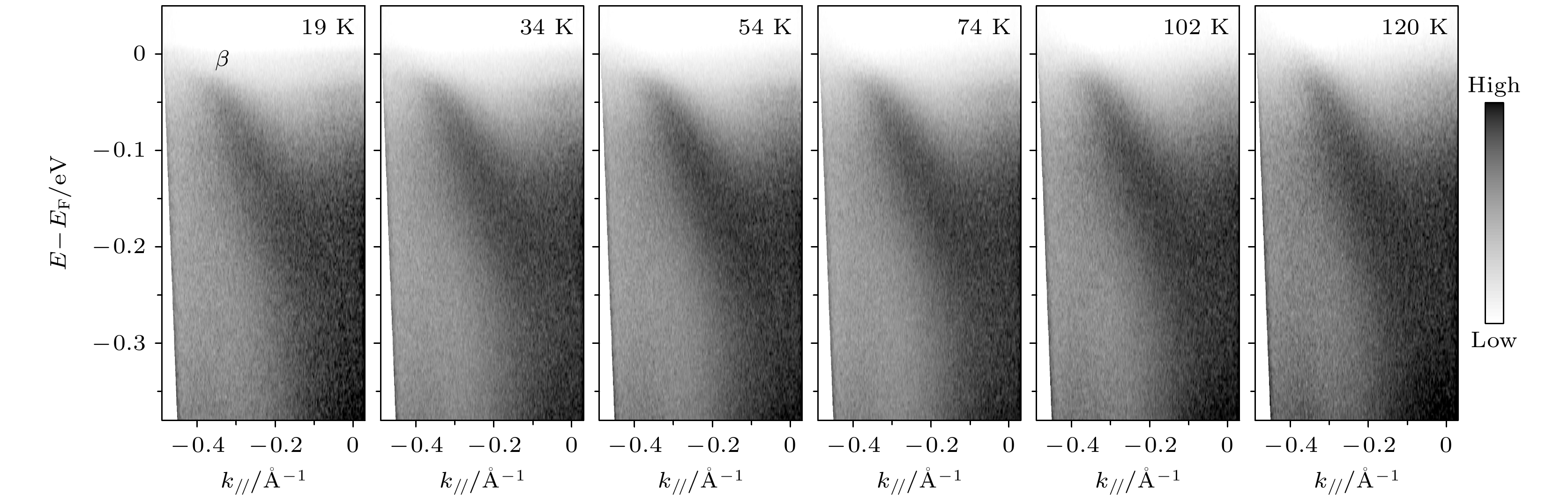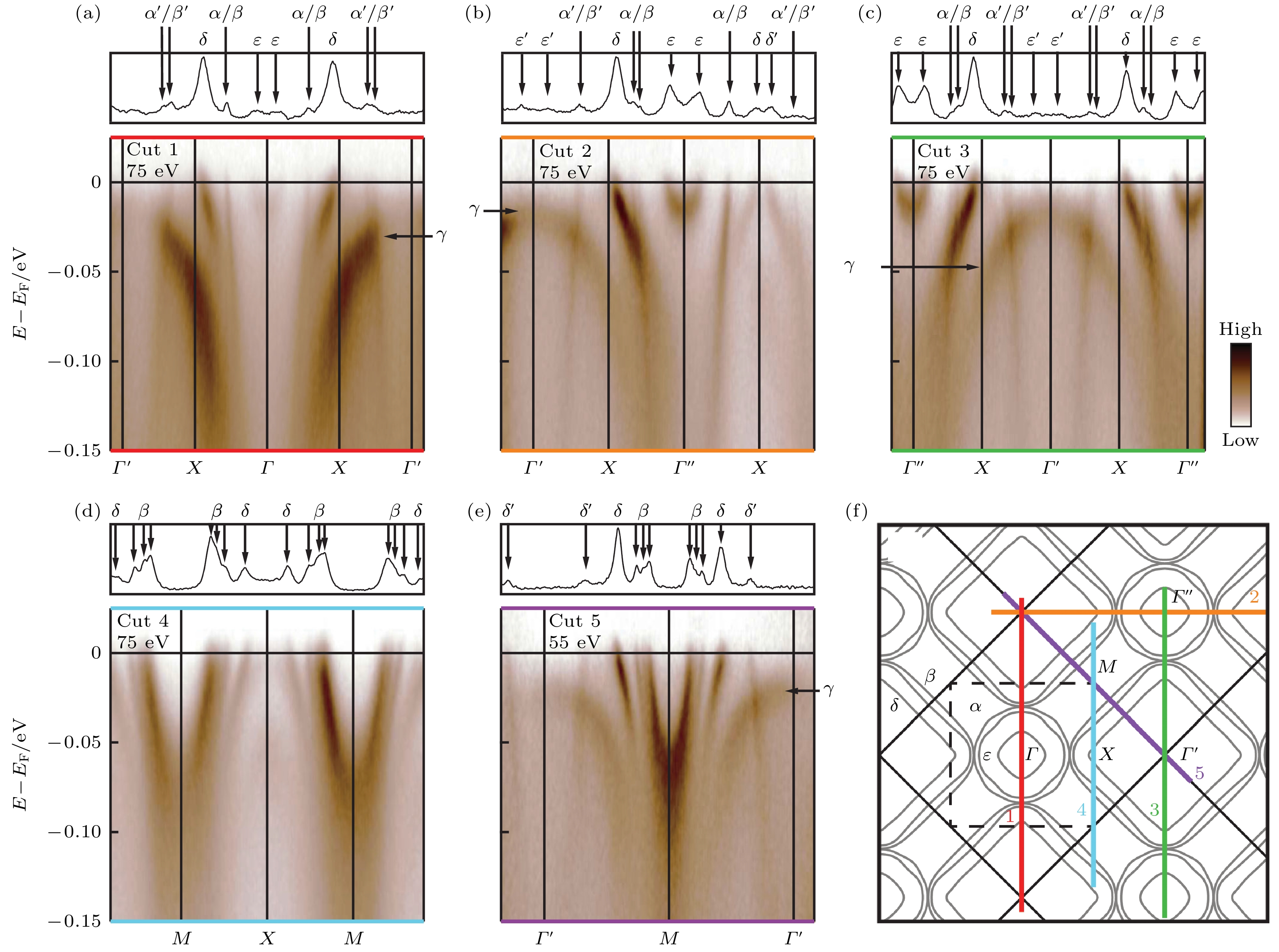 $ \overline \varGamma $ 点或第二布里渊区$ {\overline \varGamma}'$ 点的电子带α和空穴带γ. α空穴从$ \overline \varGamma $ 色散到$ \overline{S} $ 附近, 形成电子带δ. γ带则形成一条平带, 带顶在费米能以下大约30 meV的地方. 为了和理论对比, 图2中将密度泛函理论(DFT)计算的能带重整化5倍后叠加到实验谱图中, 可以看出, DFT计算能够较好地重现实验结果. 色散较强的α带和δ带对应于理论计算中的$ {\mathrm{d}}_{{x}^{2}-{y}^{2}} $ 能带, 而较平的γ带则是$ {\mathrm{d}}_{{z}^{2}} $ 能带[图2(a)]. -