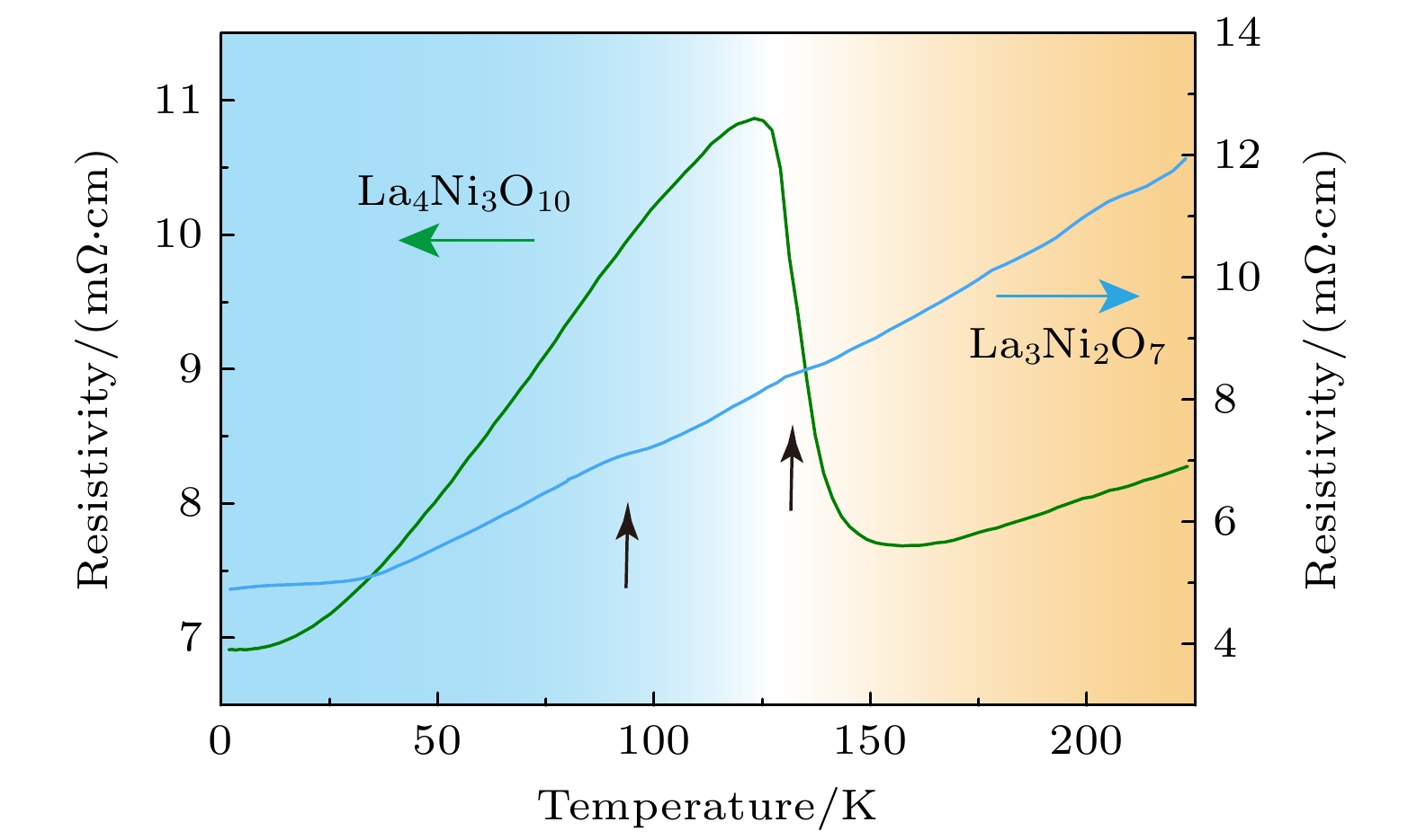 图14对比了La3Ni2O7和La4Ni3O10单晶的电阻率随温度的变化曲线. 可以看出, La4Ni3O10在132 K附近表现出电阻率的陡峭上升, 这和密度波态的形成直接相关. 而在La3Ni2O7中, 密度波态在电阻率曲线上只表现为微弱的扭折, 这可能是由于La3Ni2O7中的结构复杂性导致的密度波态涨落.
