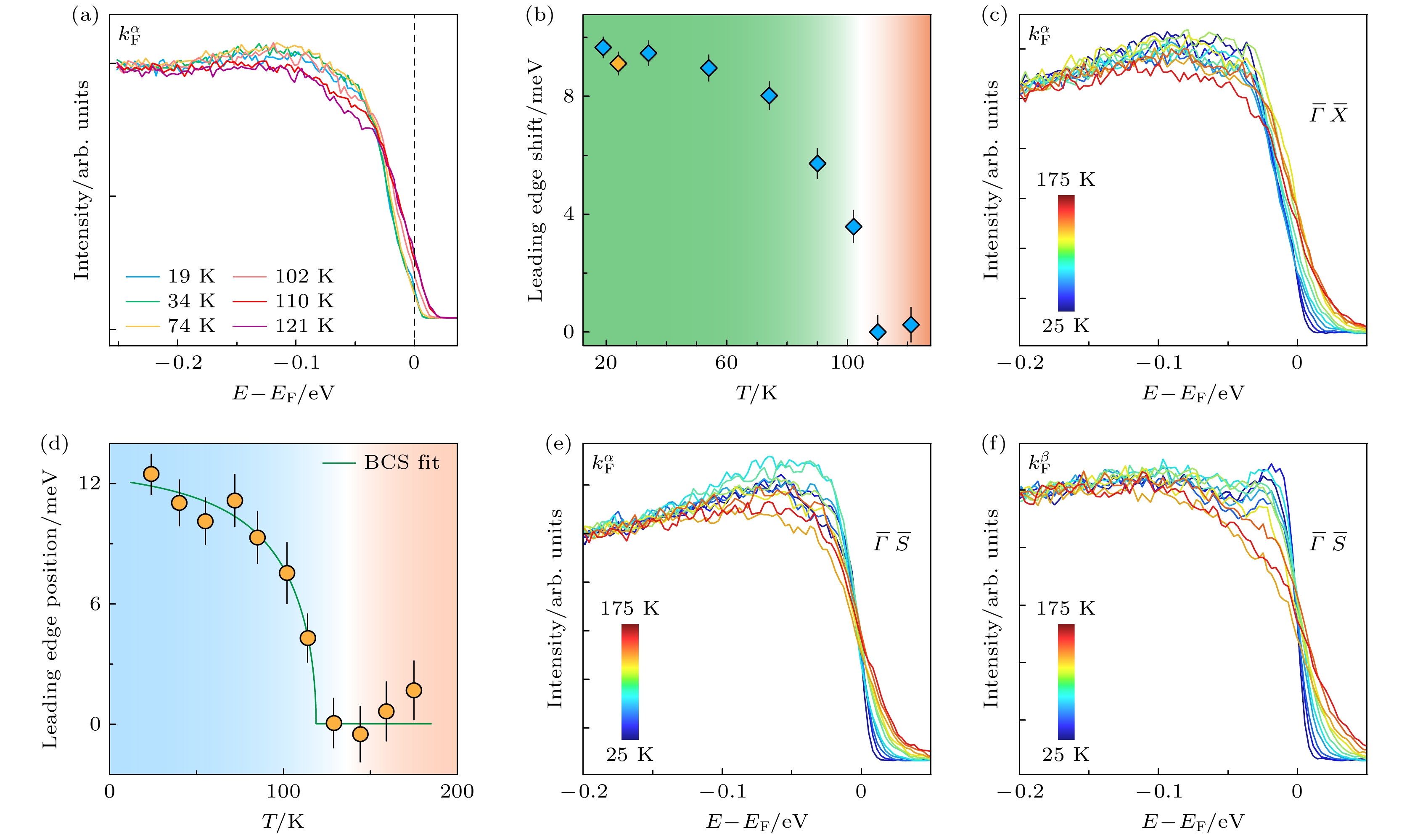 在图13所示的激光ARPES测量的La3Ni2O7的α能带随温度的变化中可以看出, 光电子能谱的谱重在费米能级附近被压制, 准粒子峰消失. 能谱在EF附近没有表现出被费米-狄拉克函数截断的特征. 从费米动量(kF)的EDC随温度的变化[图15(a), (b)]可以看出, EDC的曲线前沿随着温度降低逐渐远离EF, 表示低温下有能隙形成, 可能和体系内的电荷/自旋密度波态有关. 由于缺乏准粒子峰, 我们把这个能隙称为赝能隙(pseudogap). 在很多关联电子材料中都观察到费米能附近谱重压制形成的赝能隙, 但需注意这和铜基超导体系中超导转变温度以上形成的赝能隙有所不同.