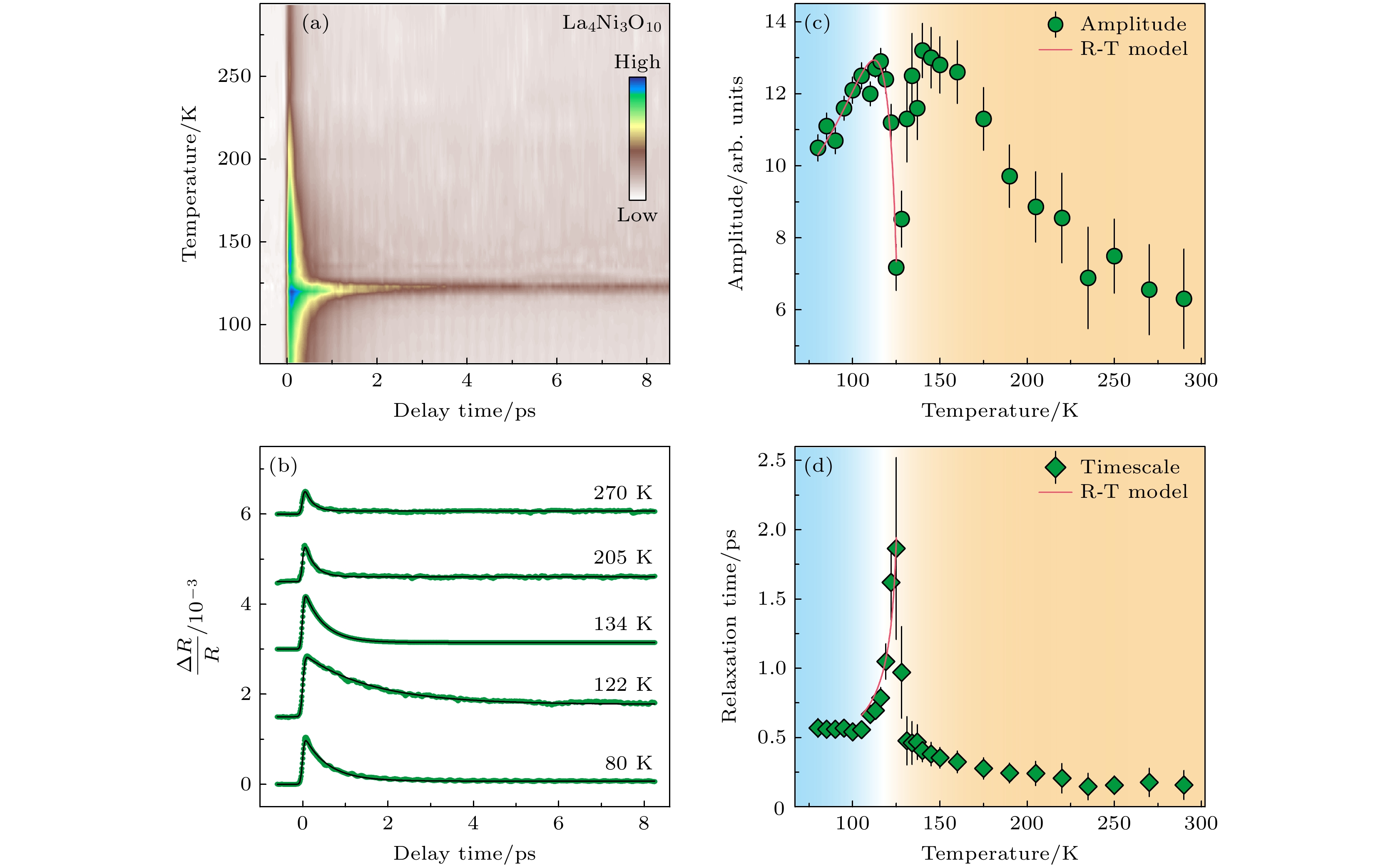 图16所示为La4Ni3O10的瞬态光学反射率随时间延迟的变化. 样品被超快脉冲激发光(脉冲宽度约30 fs)瞬时激发后, 其反射率先急剧增加, 随后呈指数衰减. 通过分析瞬态反射率的增加和 弛豫过程, 可以得到体系内载流子的寿命、有序态的能隙、微观的相互作用等关键信息. 在80 K下, La4Ni3O10的瞬态反射率的特征弛豫时间约为0.57 ps, 而随着温度升高, 瞬态反射率变化的幅度在密度波转变温度(约为132 K)附近出现下降, 而弛豫时间则表现出显著的发散行为[图16(a), (b)]. 这种发散行为可以通过R-T (Rothwarf-Taylor)模型理解. 该模型旨在阐明由载流子能隙引起的弛豫瓶颈效应[223,224], 在该模型中, 载流子寿命和能隙大小成反比, 在有序态相变温度附近, 能隙闭合, 载流子寿命表现出发散行为. 通过对R-T模型的拟合可以得出, La4Ni3O10在零温下的密度波能隙为Δ0 = 16.7±4.3 meV, 与之前的ARPES的测量结果一致[144,192].