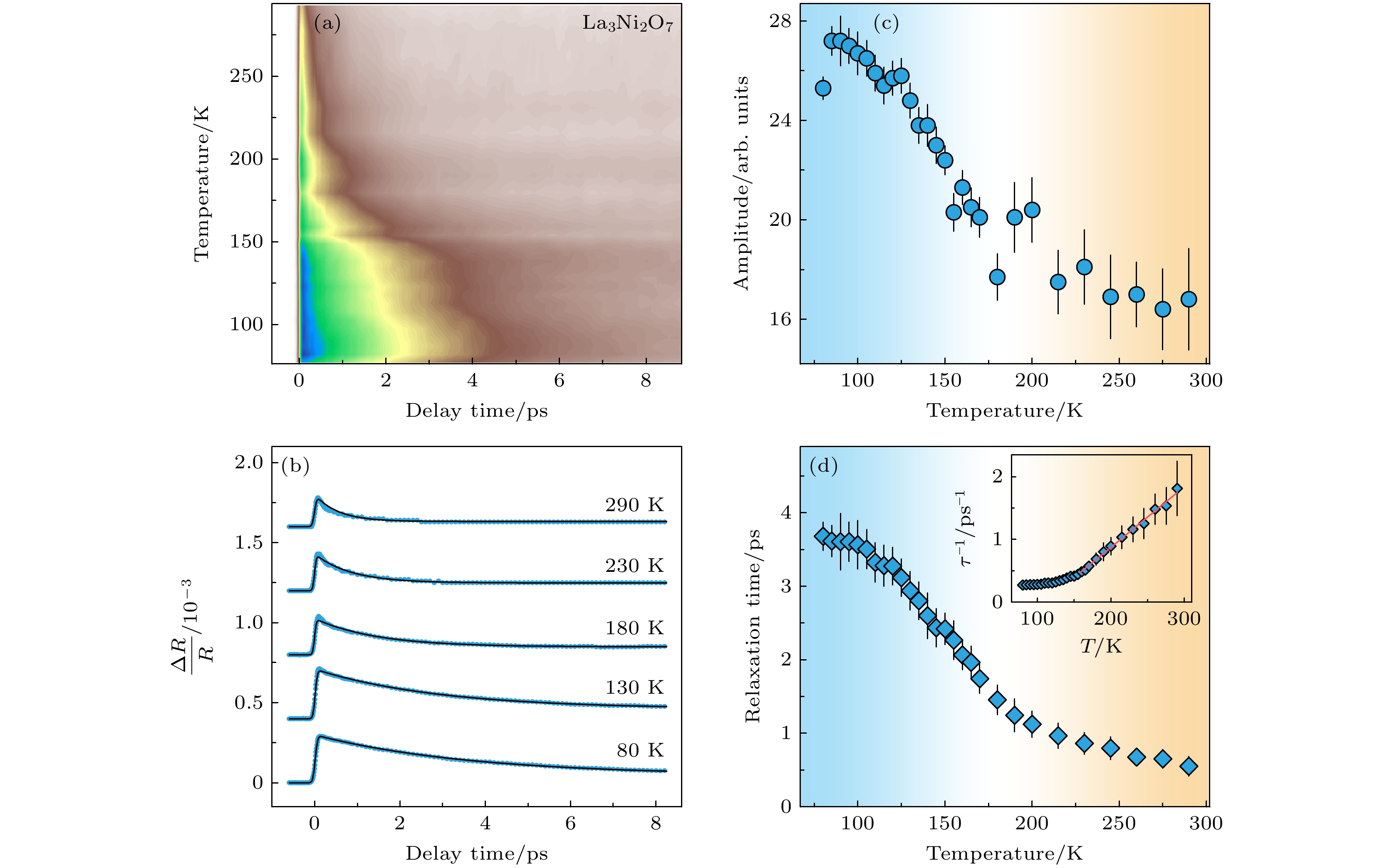 Figure 17. (a) Temperature-dependent transient reflectivity data of La3Ni2O7; (b) typical temporal evolution of ΔR/R at selected temperatures, the black curves are the phenomenological fit to the data; (c), (d) temperature dependence of the (c) amplitude and (d) relaxation time (τ) of the transient reflectivity change in La3Ni2O7, the inset of panel (d) shows the temperature dependence of 1/τ[124].