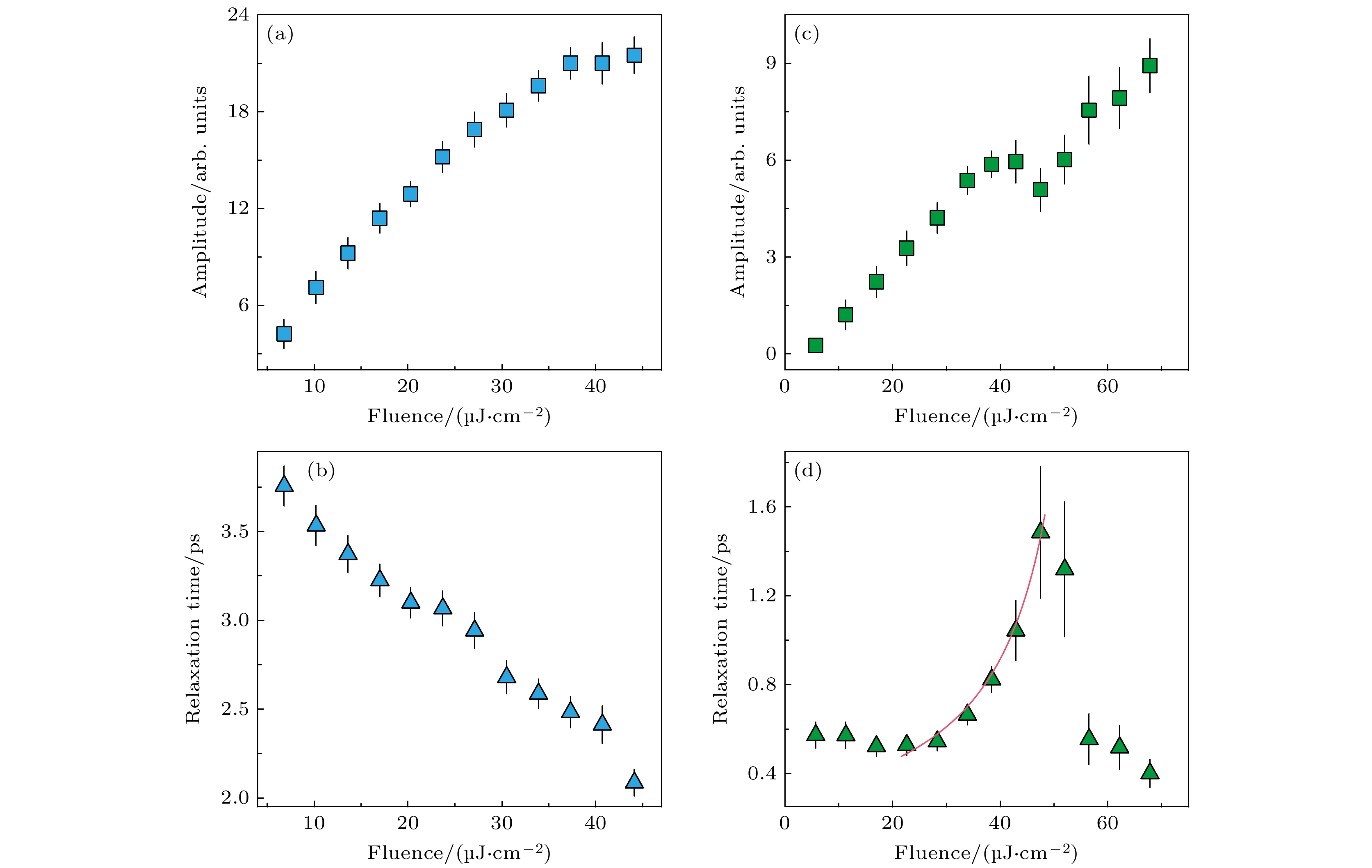 图 18 (a), (b) La3Ni2O7中提取的反射率变化的振幅(a)和弛豫时间(b)随光通量的变化趋势; (c), (d) La4Ni3O10中提取的反射率变化的振幅(c)和弛豫时间(d)随光通量的变化趋势, 其中(d)图中的红色曲线为实验数据拟合结果; (a)—(d)中所有数据均在80 K温度下测量获得[124]