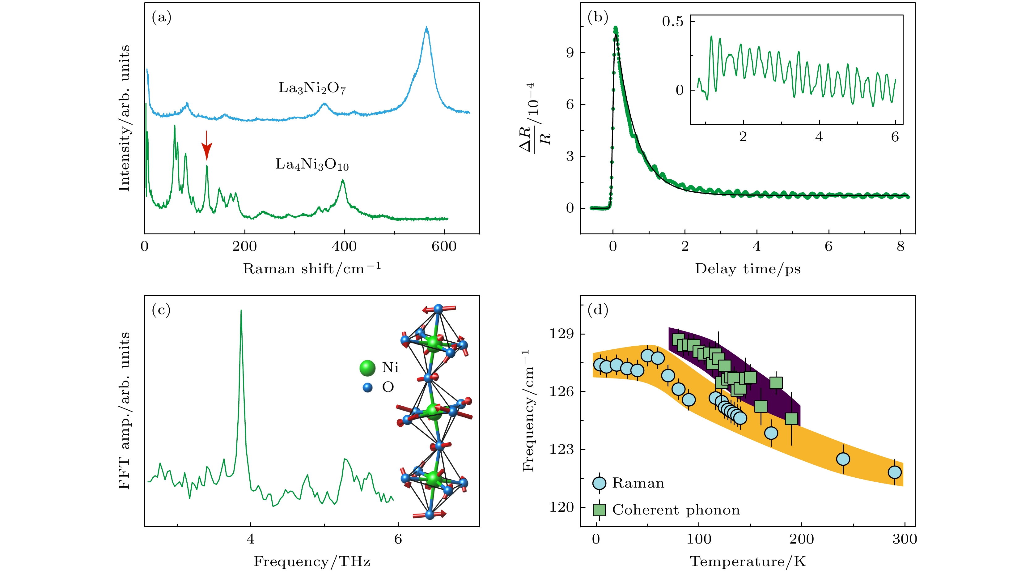 图 19 (a) La3Ni2O7和La4Ni3O10在室温下测量的532 nm拉曼光谱; (b) 80 K下La4Ni3O10的ΔR/R变化, 其中可观察到相干声子振荡. 插图显示扣除单指数背景后的信号振荡部分; (c) 信号振荡部分的傅里叶变换谱, 最主要的声子模频率位于3.87 THz处. 插图为对应的原子振动示意图, 红色箭头表示振动方向(为简化图示, 主要在平面内振动的La原子未予显示); (d) 通过超快反射率和拉曼实验测得的La4Ni3O10相干声子频率随温度的变化关系[124]