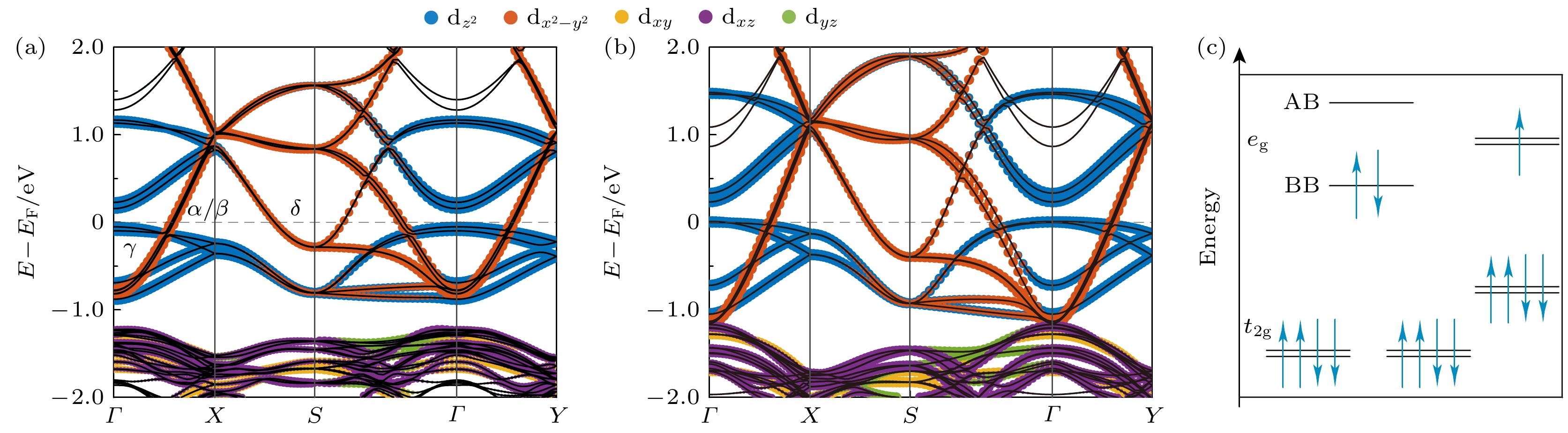 Figure 2. Orbital-projected band structures of La3Ni2O7 under (a) ambient pressure and (b) high pressure, calculated by density-functional theory (DFT)[125]; (c) schematic illustration of the electron configurations in different orbitals[2]; AB represents antibonding band, BB represents bonding band.