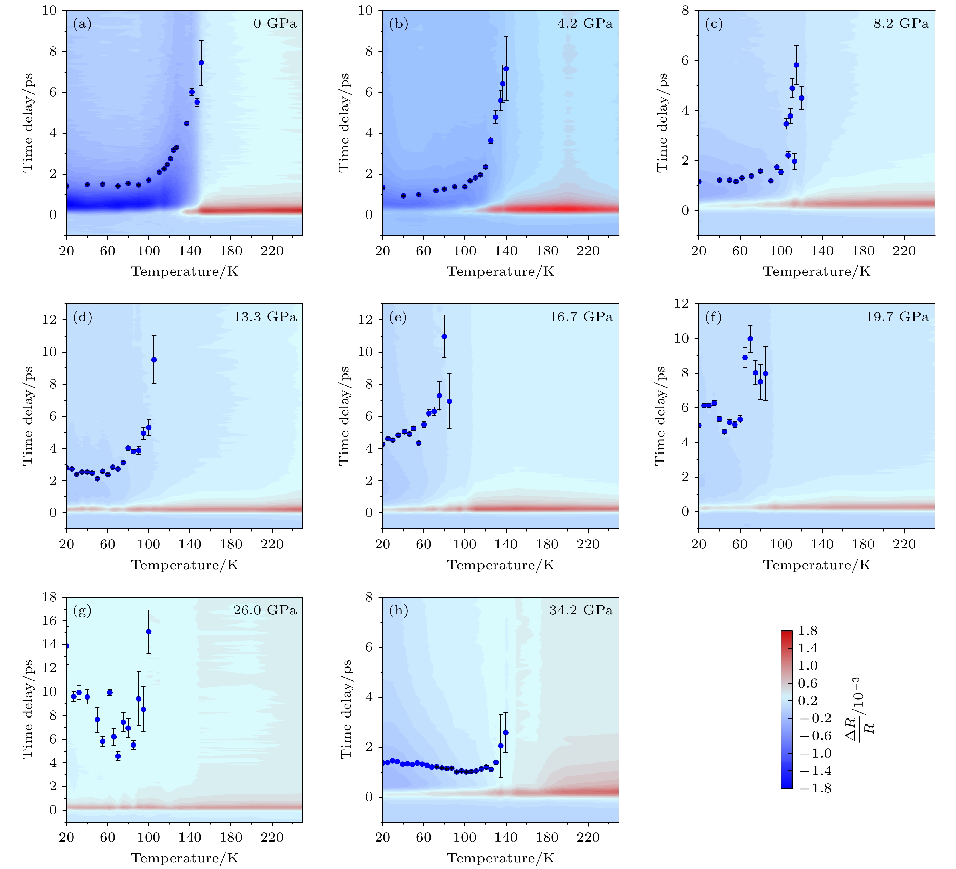 图 20 不同压力下测量的温度依赖的泵浦-探测光谱 (a)—(h)分别对应0, 4.2, 8.2, 13.3, 16.7, 19.7, 26和34.2 GPa的压力条件, 各子图中的散点表示提取的弛豫时间常数[127]