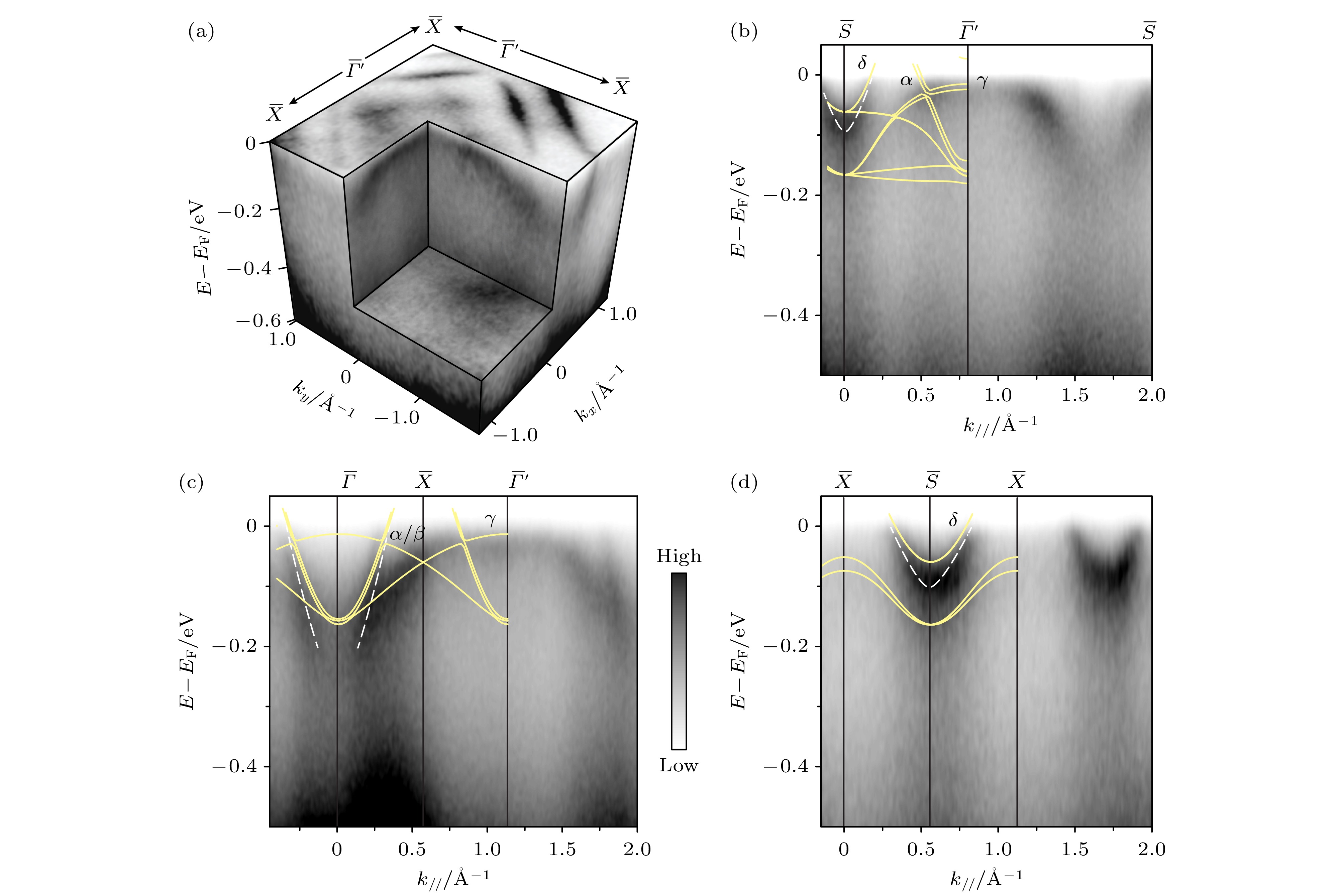 $ {\bar \varGamma '}\bar{S} $ , (c)$ \bar {\varGamma}\bar{X} $ 和 (d)$ \bar{X}\bar{S} $ 方向的能带色散; 黄色曲线为经过5倍重整化处理后的密度泛函理论计算的能带结构, 白色虚线为实验中能带色散的视觉引导线, 用于指示轨道选择性的能带重整化[125], 实验测量温度为18 KFigure 3. Band dispersions of La3Ni2O7 measured by ARPES at ambient pressure: (a) 3D plot of the electronic structure of La3Ni2O7; band dispersions along the (b)