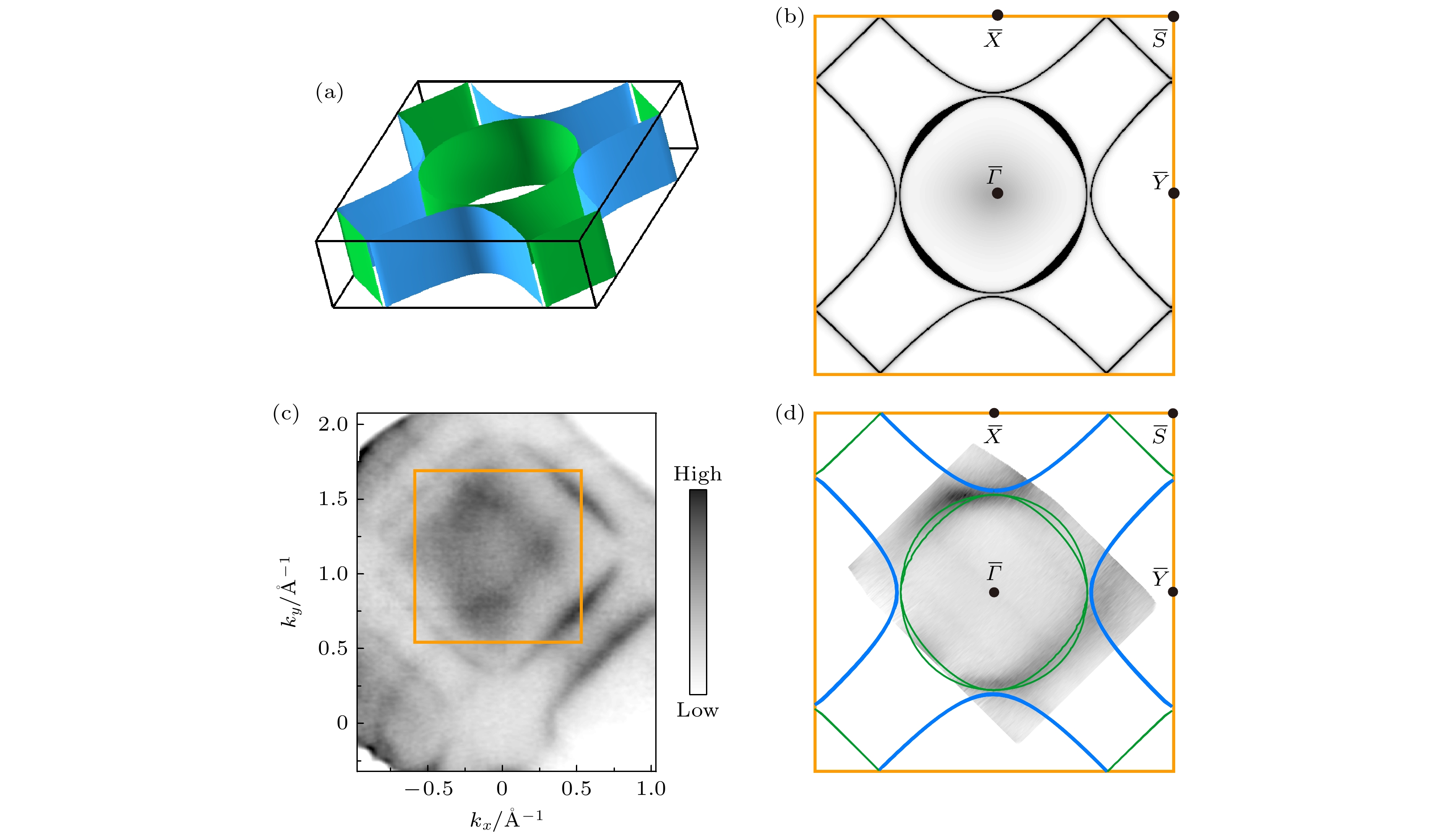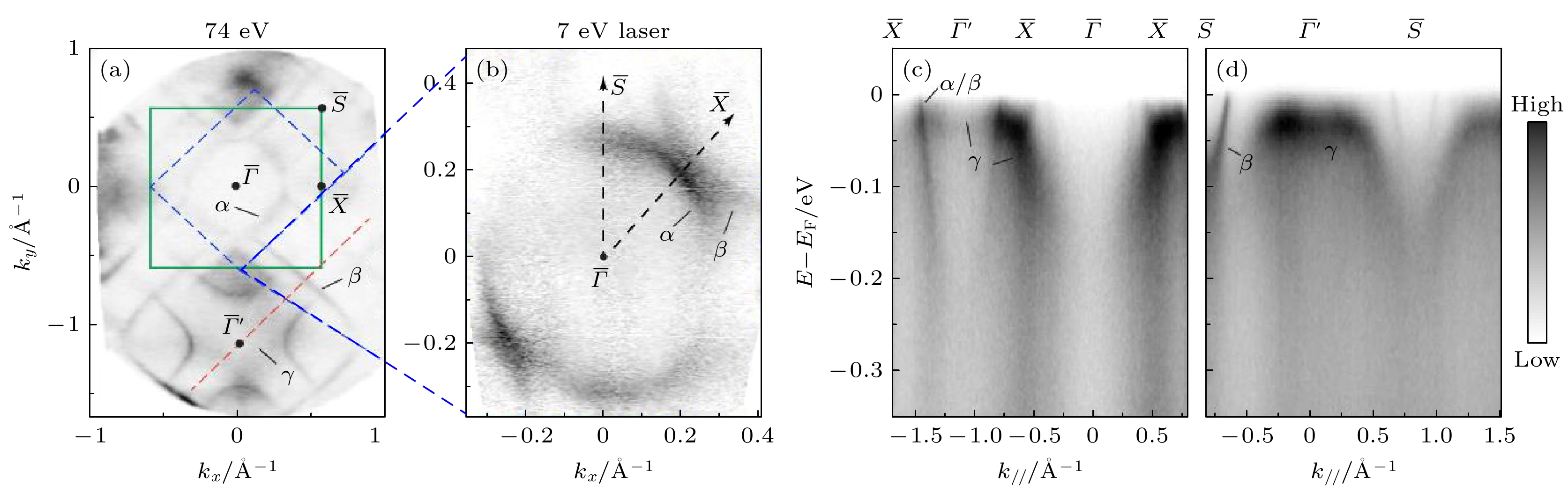 图 7 (a) ARPES测量的La4Ni3O10的费米面结构, 布里渊区以绿色实线标出; (b) 使用7 eV激光测量的费米面, 对应(a)图中蓝色虚线区域; (c), (d) 沿