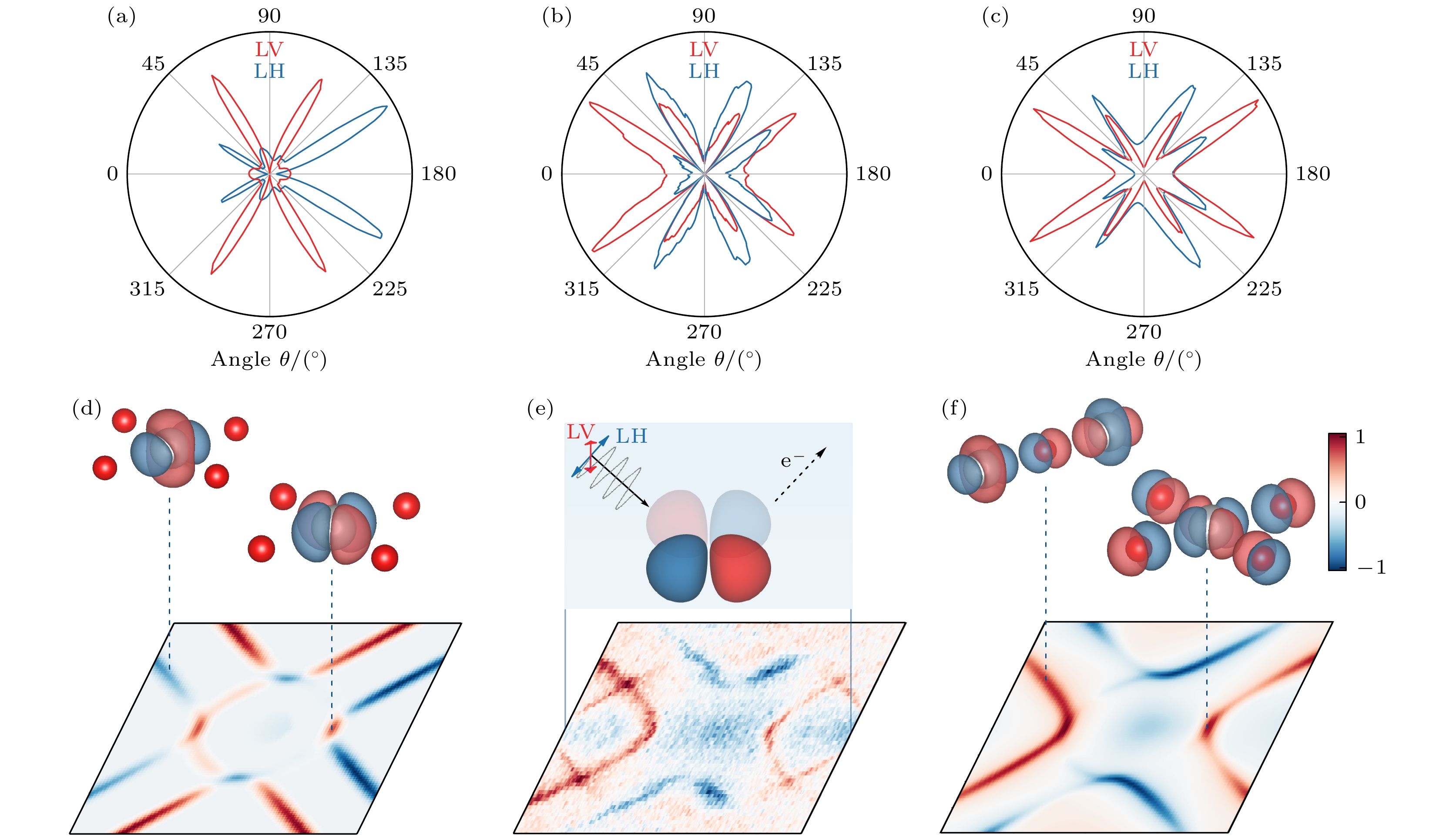 图 5 (a)—(c) 理论模拟的La3Ni2O7的光电子谱的对称性, 距原点的距离表示沿费米面特定角度方向的信号强度, LH和LV分别表示水平和竖直偏振, (a) 仅含Ni的eg轨道的有效紧束缚模型的模拟结果; (b) 实验测得的光电子能谱沿不同方向的强度; (c) 同时包含Ni的eg轨道和O的p轨道的有效紧束缚模型的模拟结果; (d), (f) (上图)费米面特定动量处的波函数示意图(红色与蓝色表示相对相位, 红/银色球体分别代表O/Ni原子); (下图)利用(a), (c)中对应的模型模拟的ARPES二向色性信号(LV-LH); (e) (上图)实验中光偏振矢量与面内轨道的相对取向; (下图)实测的ARPES二向色性信号[159]