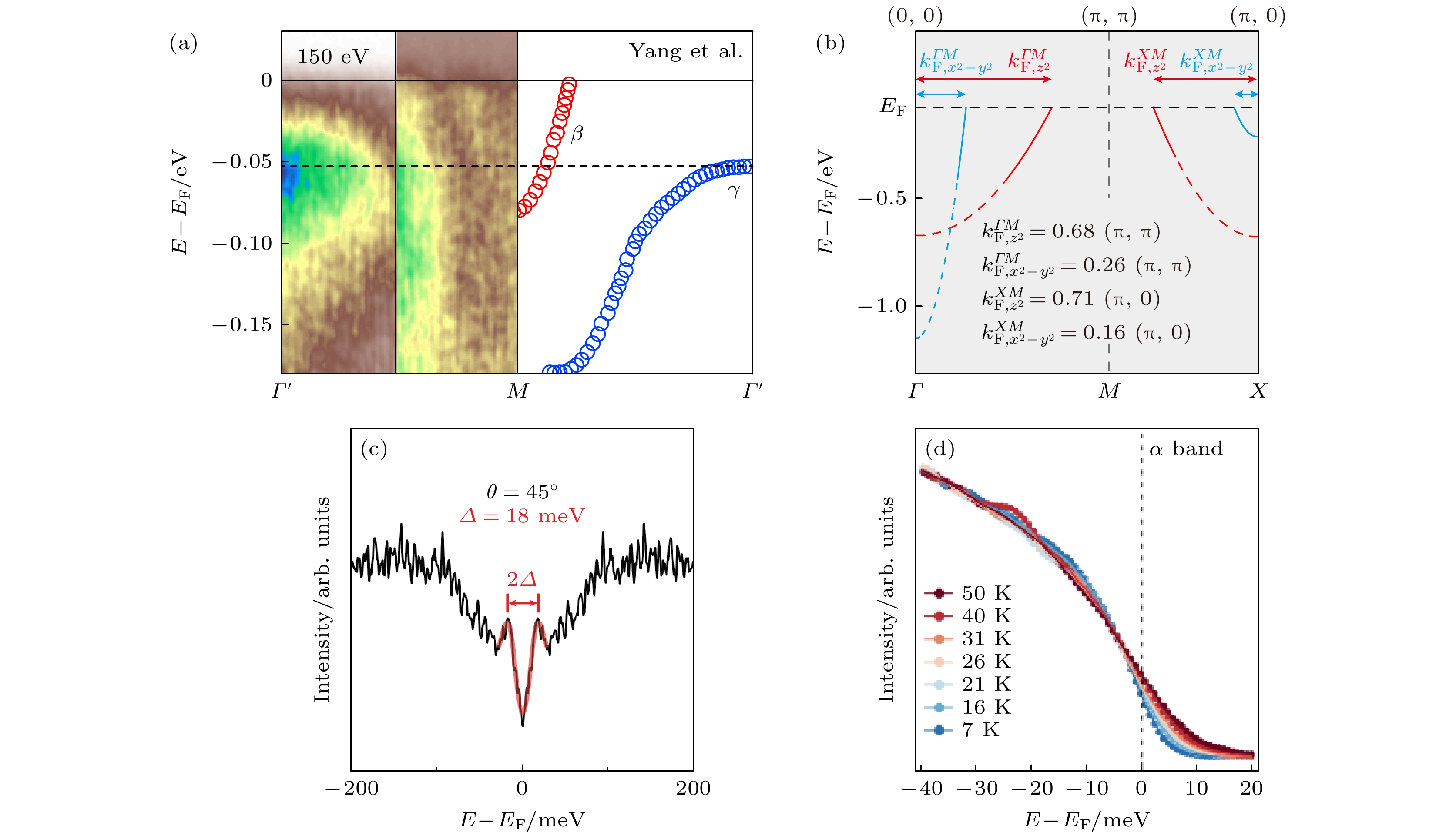 $ {\mathrm{d}}_{{x}^{2}-{y}^{2}} $ 能带上移而$ {\mathrm{d}}_{{z}^{2}} $ 能带下移, 但是$ {\mathrm{d}}_{{z}^{2}} $ 能带相对体单晶的能带移动比理论预言的结果小5—10倍[115,116]. 在臭氧处理的薄膜样品中, γ平带位于费米能以下约70 meV, 并不像理论预期的那样更接近费米能. 更加值得注意的是, 在不同研究组的实验中,$ {\mathrm{d}}_{{z}^{2}} $ 表现出较为明显的色散并且穿越了费米能级. 这一结果也引发了关于$ {\mathrm{d}}_{{z}^{2}} $ 平带在高压超导态中所起作用的重新思考和争论, 对超导薄膜样品电子结构的更精细测量是理解这一问题的关键.更加值得注意的是, 近期ARPES对超导薄膜样品的超导能隙结构给出了初步的探测结果[图8(c), (d)]. 不同研究组测到的超导能隙的大小较为接近, 为1—2 meV. 实验测得了无节点的超导能隙, 和铜基超导体的d波对称性的超导能隙不同. 实验还表明超导能隙在超导转变温度以上很高的温区依然存在, 这一结果进一步促使研究者思考超导能隙和赝能隙之间的关系.