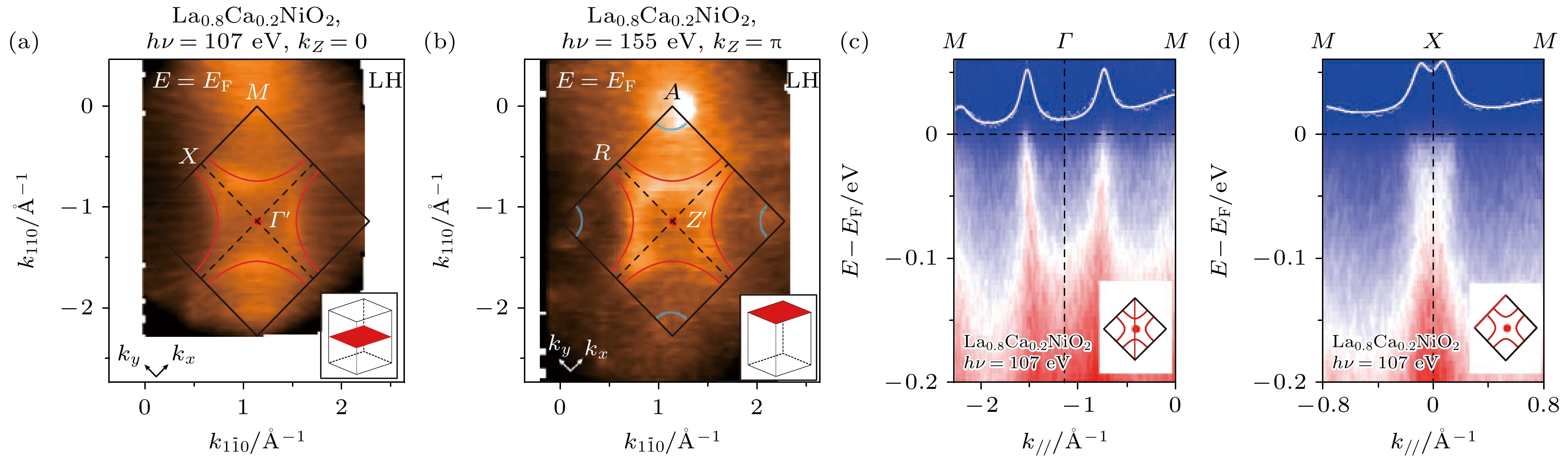 图 9 (a) 在Γ-M-X平面(kz = 0)和 (b) Z-A-R平面(kz = π)测量的无限层镍氧化物超导体La0.8Ca0.2NiO2薄膜的费米面; (c), (d) 利用107 eV的光子测量的沿M-Γ-M方向(c)和M-X-M方向(d)的能带色散, EF处的MDC表明了费米穿越的动量位置[214]