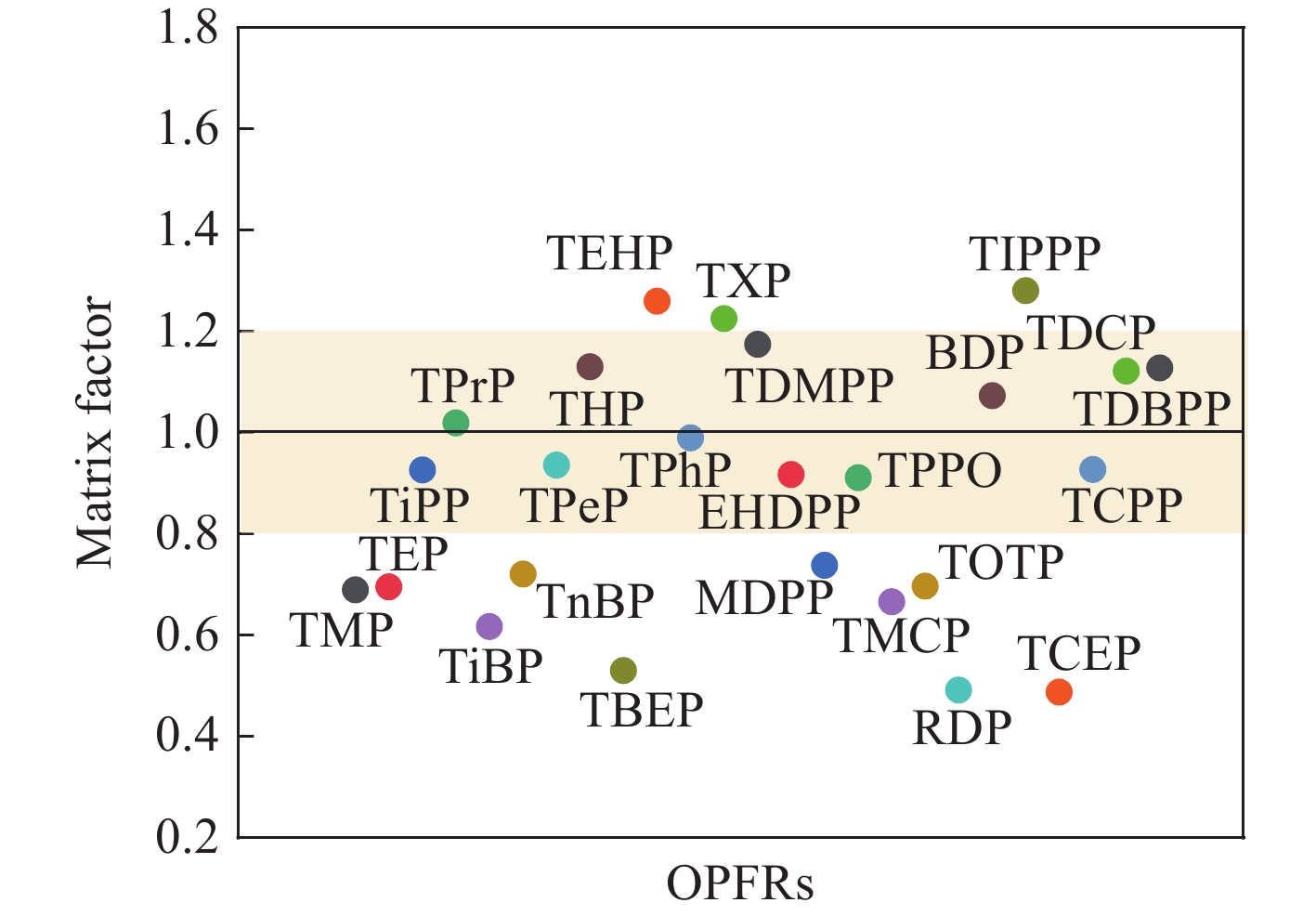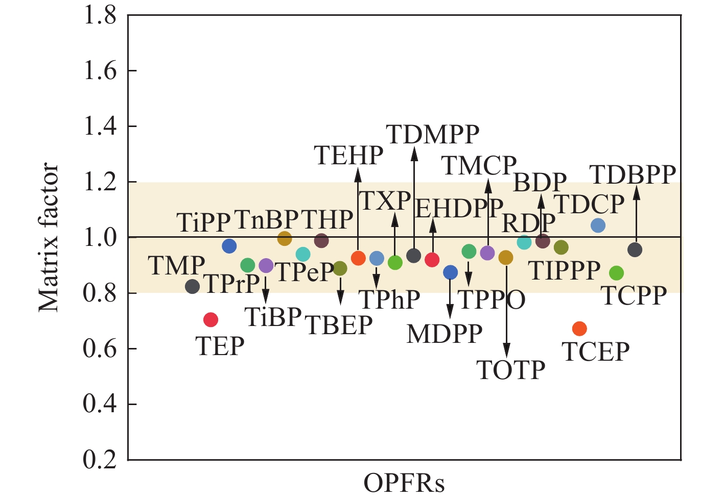 通过对比固相萃取小柱,发现Si/PSA小柱的净化性能相对较优,但TMP、TEP等小分子易挥发物质在氮吹步骤中易损失。因此,尝试采用Si和PSA组分以分散固相萃取方式直接对提取液进行净化,具体过程如下:取2 mL提取液于玻璃试管中,加入一定量的Si和PSA,涡旋1 min,静置后取上清液过滤测试。通过优化Si和PSA用量,选定分散固相萃取剂用量为200 mg Si和200 mg PSA。分散固相萃取和Si/PSA固相萃取柱的回收率示于图6。可见,使用200 mg Si和200 mg PSA分散固相萃取能够有效净化提取液,总体效果优于Si/PSA小柱,避免了柱子活化及氮吹等步骤,在提高回收率的同时节约了成本,简化了操作流程。因此,选择分散固相萃取方式对提取液进行净化。此外,采用乙腈提取不含目标物的空白样品,提取液经分散固相萃取后用于配制标准溶液,绘制标准曲线,以该标准曲线斜率和乙腈直接配制的标准曲线斜率的比值计算基质因子,结果示于图7。提取液经净化后,TEP和TCEP的基质因子由未净化时的0.69和0.49升至0.71和0.67,其余物质的基质因子均位于0.8~1.2之间,表明经Si和PSA分散固相萃取后,有效降低了基质效应的影响。
