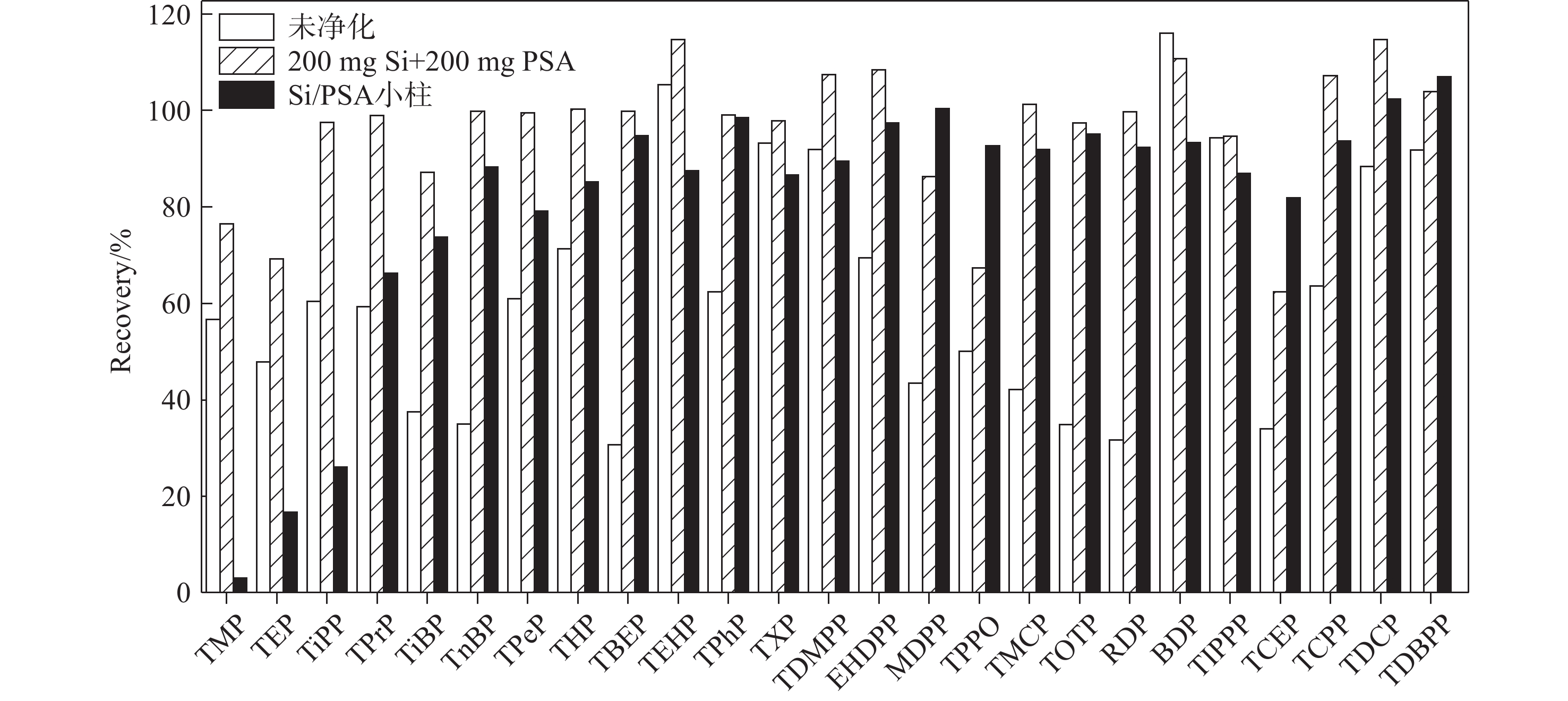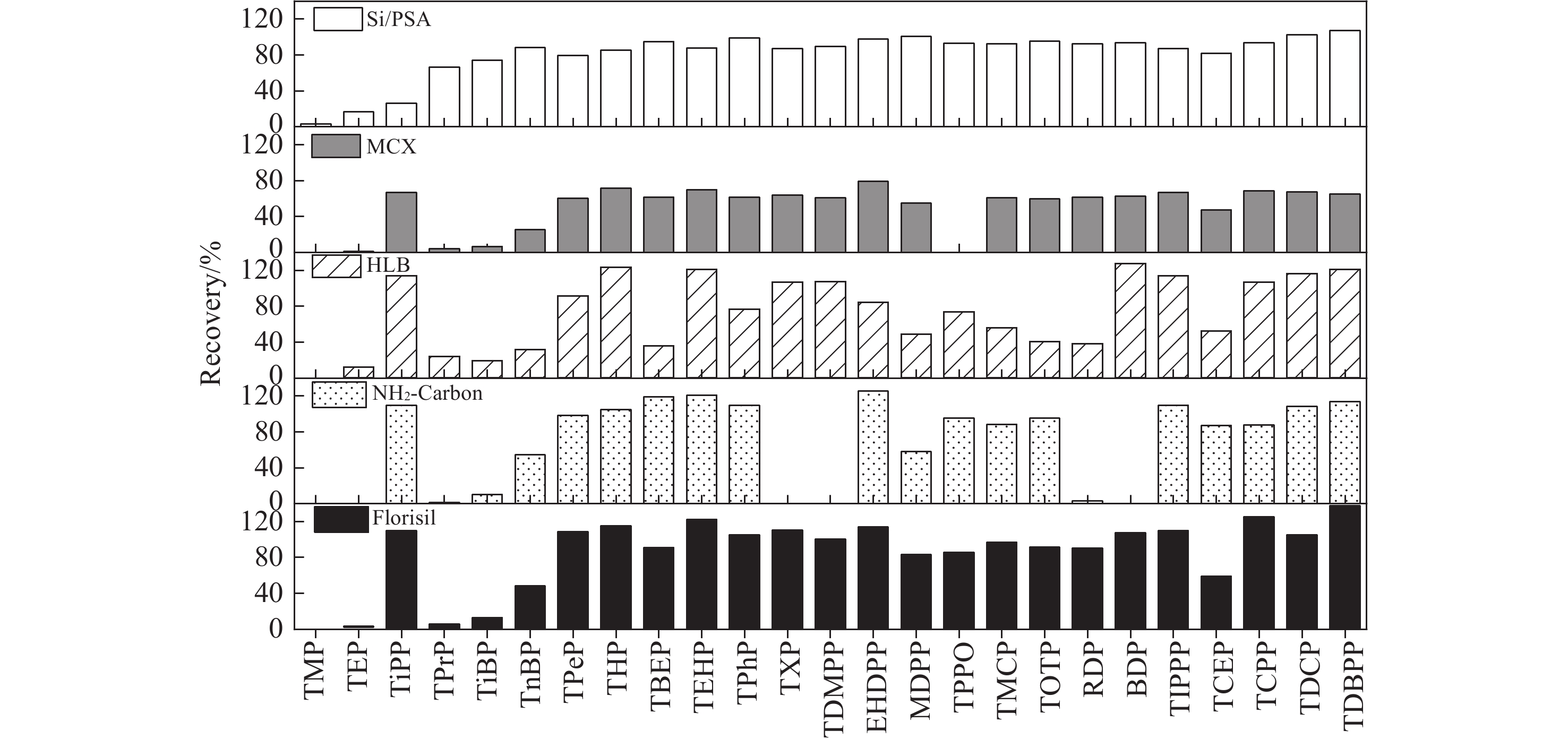 本研究采用传统的固相萃取小柱Florisil、NH2-Carbon、HLB、MCX和Si/PSA净化提取液。首先,采用3 mL乙酸乙酯和乙腈活化Florisil、NH2-Carbon和Si/PSA柱,3 mL水、乙酸乙酯和乙腈活化HLB和MCX柱;活化后,取2 mL提取液缓慢过柱,随后分别用3 mL乙腈和乙酸乙酯淋洗及洗脱。为明确各小柱的净化或富集作用,将各阶段收集的液体在40 ℃下氮吹至干,随后用2 mL乙腈复溶,过0.22 μm尼龙滤头后测试。各固相萃取小柱不同阶段的净化效果示于图4a~4e。结果表明,Florisil、HLB、MAX和Si/PSA小柱在上样和淋洗阶段均有较多目标物质流出,表明以上填料对目标物质的保留作用较弱,仅可以去除基质中的杂质干扰;NH2-Carbon小柱对不同OPFRs的吸附保留能力区别较大,不适用多种OPFRs的同时净化或萃取。此外,由于氮吹过程的损失,TMP和TEP在所有小柱的净化过程中均呈现极低的回收率。计算各固相萃取柱的总回收率,结果示于图5。相较而言,Si/PSA小柱表现出更好的净化作用,大部分OPFRs回收率相对较高。