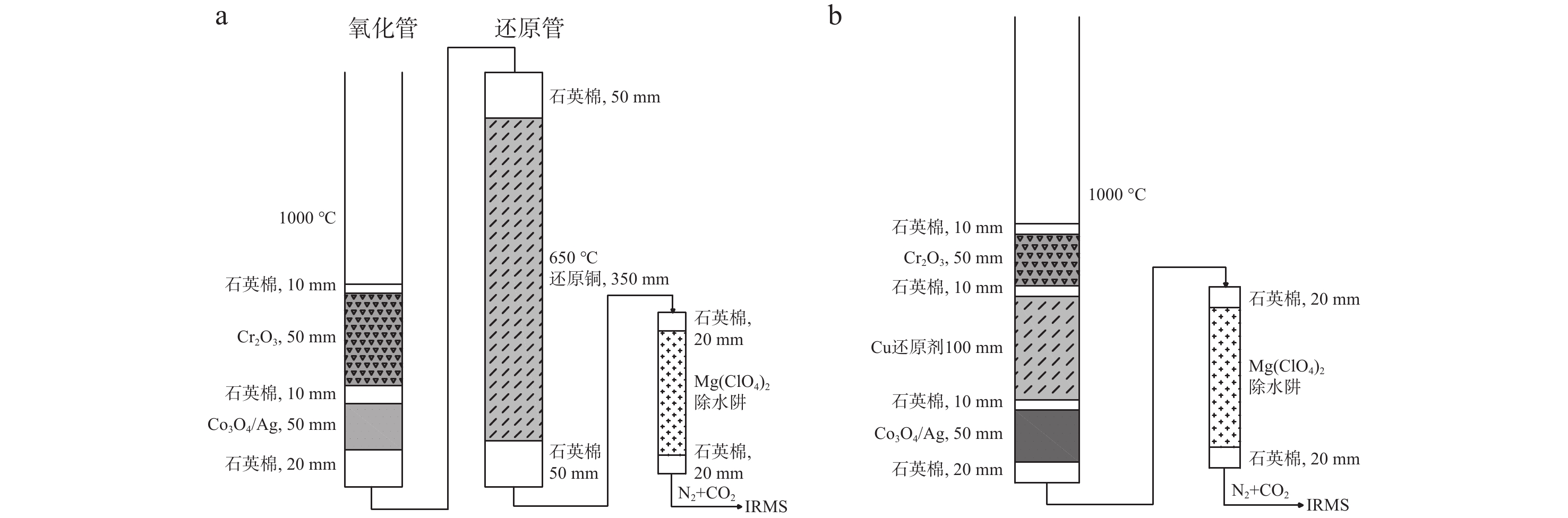 相比传统EA配备的双反应炉(左炉为氧化管,右炉为还原管,温度分别设置为1 000和650 ℃),新型EA Isolink采用了新设计[24],右炉采用1根上部填充氧化剂、下部填充还原剂的单反应管,炉温1 000 ℃下同时进行氧化和还原;左炉则用于高温裂解法测定H/O。EA Isolink和传统EA测定碳、氮时的反应管配置对比示于图1。本课题组通过前期实验发现,EA-IRMS的反应管配置方式、样品燃烧状态和填料消耗情况对氮同位素比值测定影响显著。对比碳同位素0.1‰的测定精度,氮同位素的测试精度通常仅为0.2‰~0.3‰。