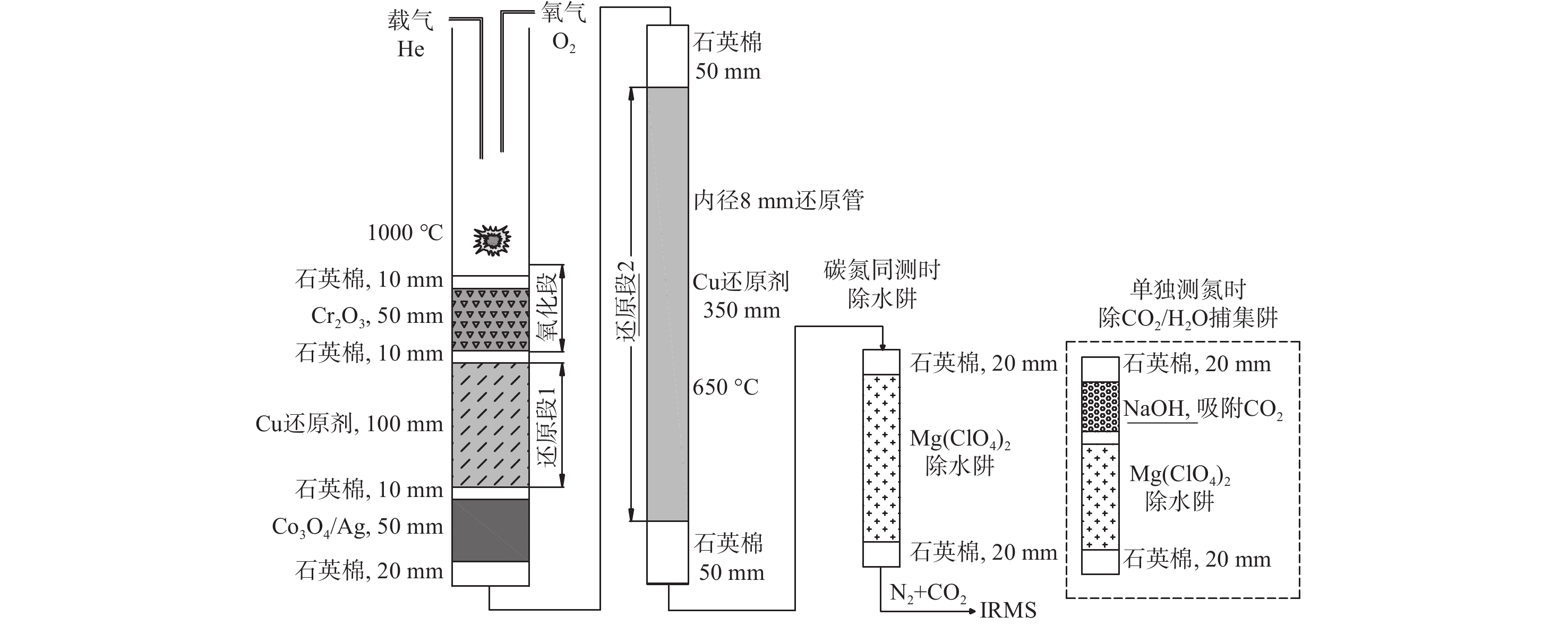 在EA Isolink右炉原单管配置的基础上,为增强对气体产物中氮氧化物(NOx)的还原能力并改善峰形和灵敏度,在左炉内增设细内径还原管(定制石英反应管内径为8 mm,填料为高纯Cu丝;传统EA还原管内径为14 mm),温度设置为650 ℃。碳氮同测模式时,除水阱填料为Mg(ClO4)2,用于去除反应气体产物中的水蒸气;单独测氮模式时,在原水阱的基础上增加NaOH化学捕集阱,用于去除反应气体产物中的水蒸气,同时也可洗脱气流中的CO2。优化后EA Isolink反应管配置示于图2。