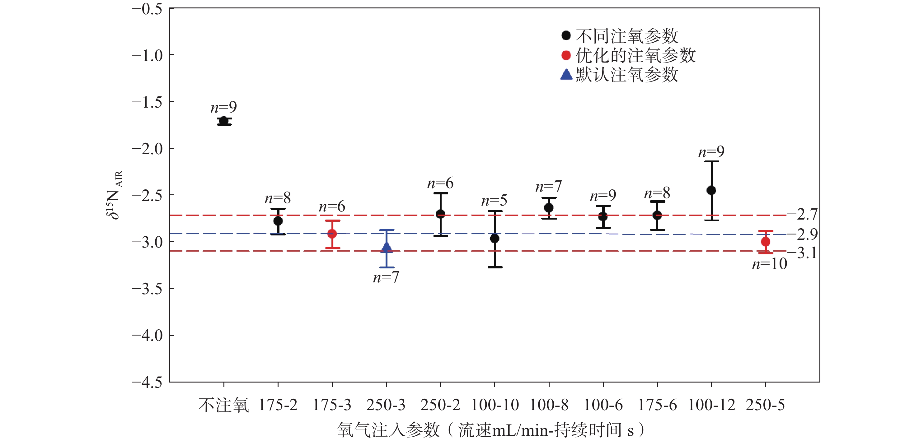 不同燃烧条件下,尿素样品δ15N值的测量结果示于图3。结果表明,当氧气注入量较低或完全不注氧时,由于样品不完全氧化,测量的δ15N值会发生一定程度的正偏移,且具有较大的标准偏差(±0.2‰)。值得注意的是,在完全不注氧的条件下,其δ15N值为(−1.70±0.03)‰,虽然有较高的精度(标准偏差±0.03‰),但同位素值发生了约+1.2‰的正偏移。当采用高流速氧气注入模式(流速250 mL/min,注氧时间5 s,以及流速175 mL/min,注氧时间3 s)时,在样品完全氧化状态下,其δ15N测量值分别为(−2.99±0.118)‰和(−2.91±0.146)‰(1σ,n=10),与预期的δ15N值((−2.90±0.2)‰)一致。当注氧流速较低且持续时间较长时(如流速100 mL/min,注氧时间10 s),其δ15N测量值为(−2.96±0.30)‰,具有较大的标准偏差。不同注氧条件下,δ15N值测量结果的t检验具有显著性(p<0.05),表明不同燃烧条件对δ15N值和不确定度具有显著影响。