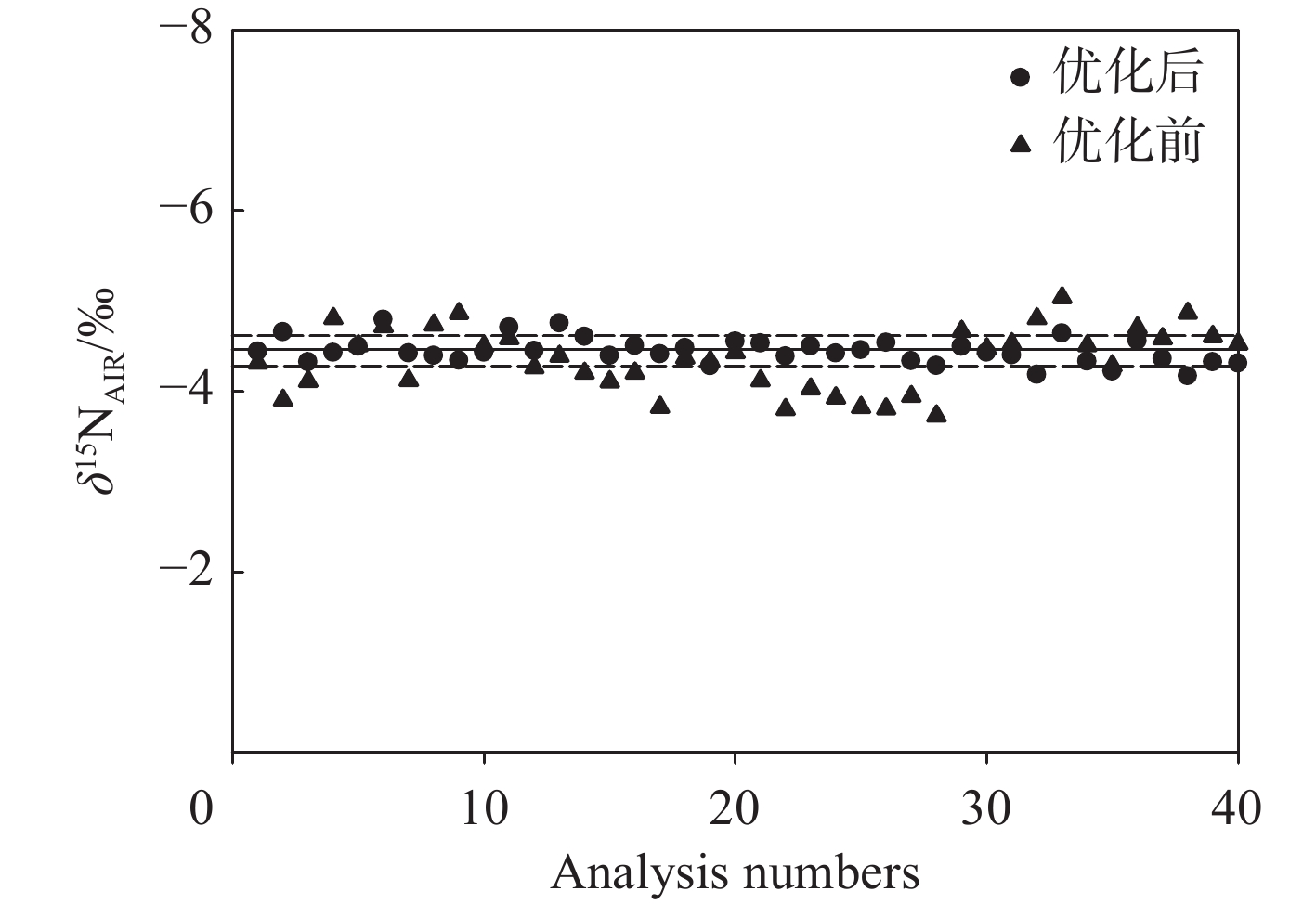 δ15N/‰(1σ)单反应管 否 −3.04±0.99 −4.28±0.33 +0.24 −4.52±0.12 是 −5.93±0.23 −4.67±0.14 −0.15 优化后双反应管 否 −3.39±0.16 −4.54±0.14 −0.02 是 −4.39±0.13 −4.52±0.10 — 表 4 不同反应管配置模式下氮同位素测量的灵敏度和检出限对比