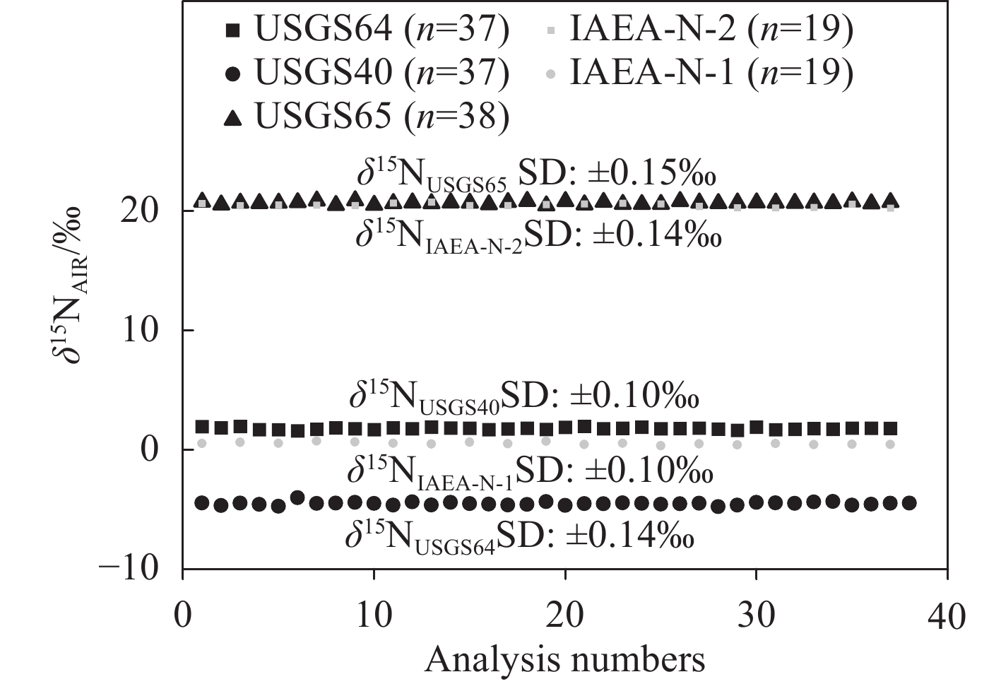 高纯He、O2、N2和CO2:浓度均为99.999%,青岛德海伟业科技有限公司产品;国际标准物质USGS65、USGS64、USGS40、IAEA-N-1和IAEA-N-2:由国际原子能机构提供;尿素(δ15N标准值为(−2.90±0.2)‰):英国EMA公司产品;实验采用的国际标准物质氮同位素标准值列于表1。