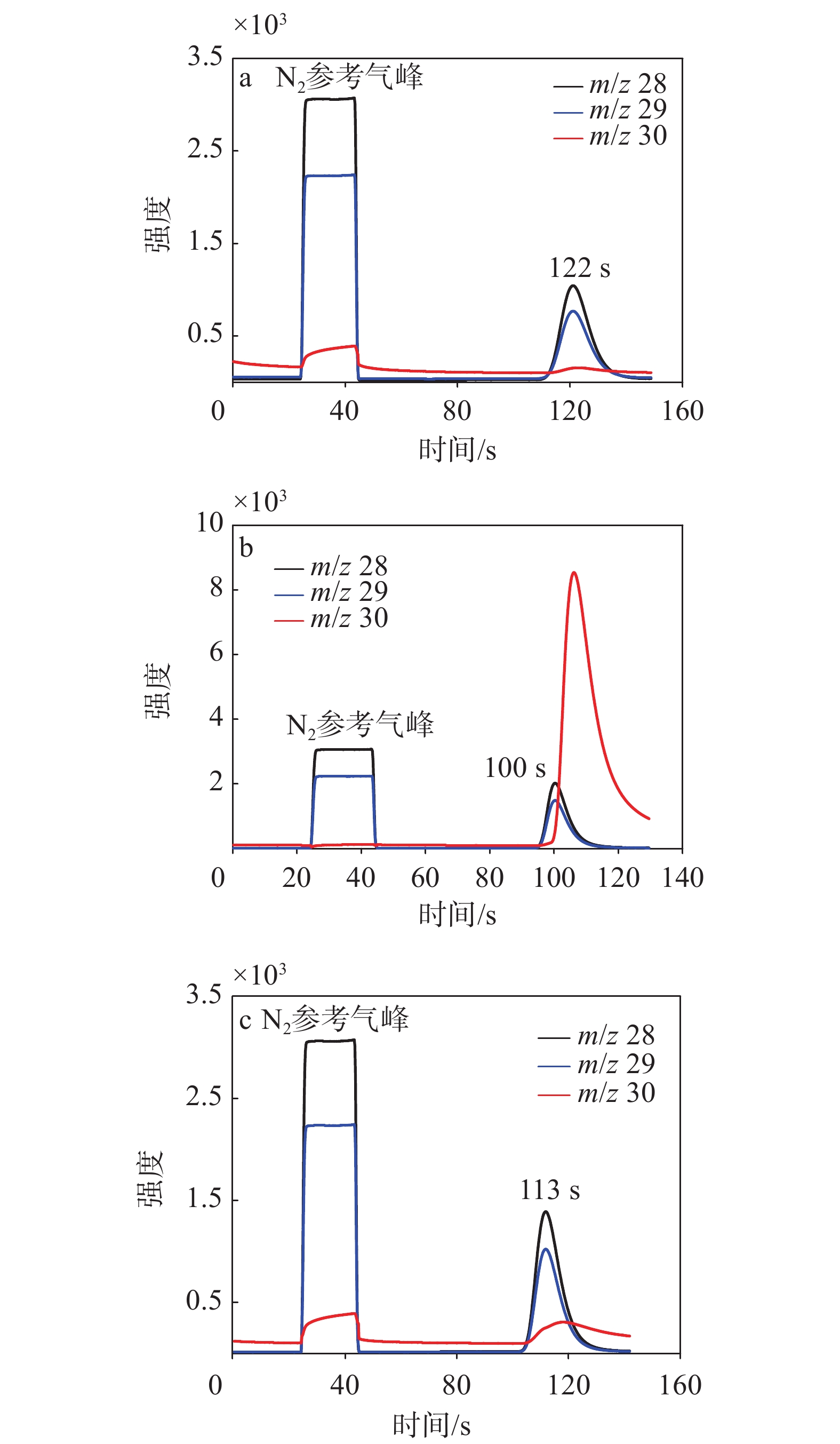 EA-IRMS系统采用不同反应管配置时,测定氮同位素的参考气峰和样品峰示于图6。当采用左炉氧化和右炉还原的双反应管(采用默认配置内径14 mm的石英管)时,虽然氮氧化物可被充分还原为N2,但大大增加了反应管路内部体积,导致出峰时间最晚(约120 s),生成的目标气体浓度较低,引起灵敏度下降(m/z 28峰强度1 000 mV)、峰展宽较大(46 s)和峰拖尾等问题,示于图6a。当采用单反应管时,由于具有高流速(180 mL/min)、更小的死体积,出峰时间最早(约100 s),待测目标峰的强度显著提高(m/z 28峰强度2 000 mV),且峰形较好(峰宽35 s)。但是,由于产物中的NO无法被充分还原,会被电离为14N16O+,从谱图上表现为m/z 30峰异常高,导致氮同位素测定时出现较大偏差,示于图6b。采用本研究优化后的方案,在单反应管基础上增加细内径还原管后,可极大增强对氮氧化物的还原能力,谱图上m/z 30峰背景很低。同时,由于新增加的还原管内径为8 mm,低于传统EA还原管内径(14 mm),较小的内部体积在保证较高峰强度(m/z 28峰强度