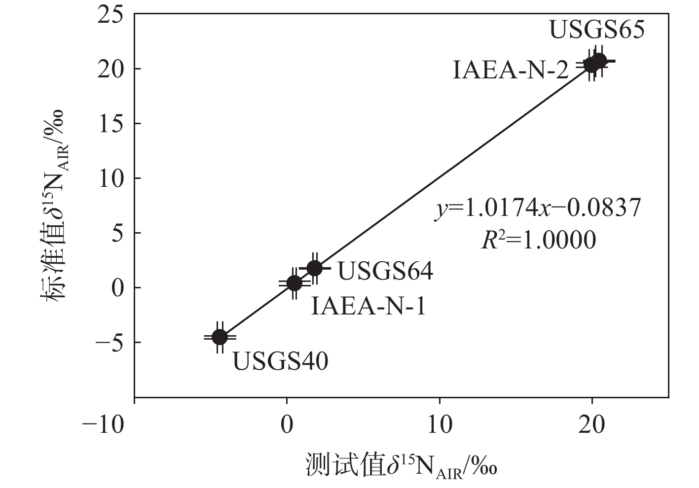 采用一系列标准物质在较长周期、不同批次测定时的外精度评估EA Isolink-IRMS系统的重现性。基于优化后的反应管配置和参数条件,自2024年1~9月的日常测定样品实验中(共计50个不同批次),采用USGS65、USGS40、USGS64、IAEA-N-1和IAEA-N-2等5种标准物质进行监控测试。在9个月的测试周期内,多批次间各标样的δ15N测试值标准偏差分别为0.15‰、0.14‰、0.12‰、0.10‰和0.15‰,长时间、不同批次内平行标样的重现性良好,外精度优于0.15‰。各标准物质测试值和标准值的线性拟合回归方程为y=