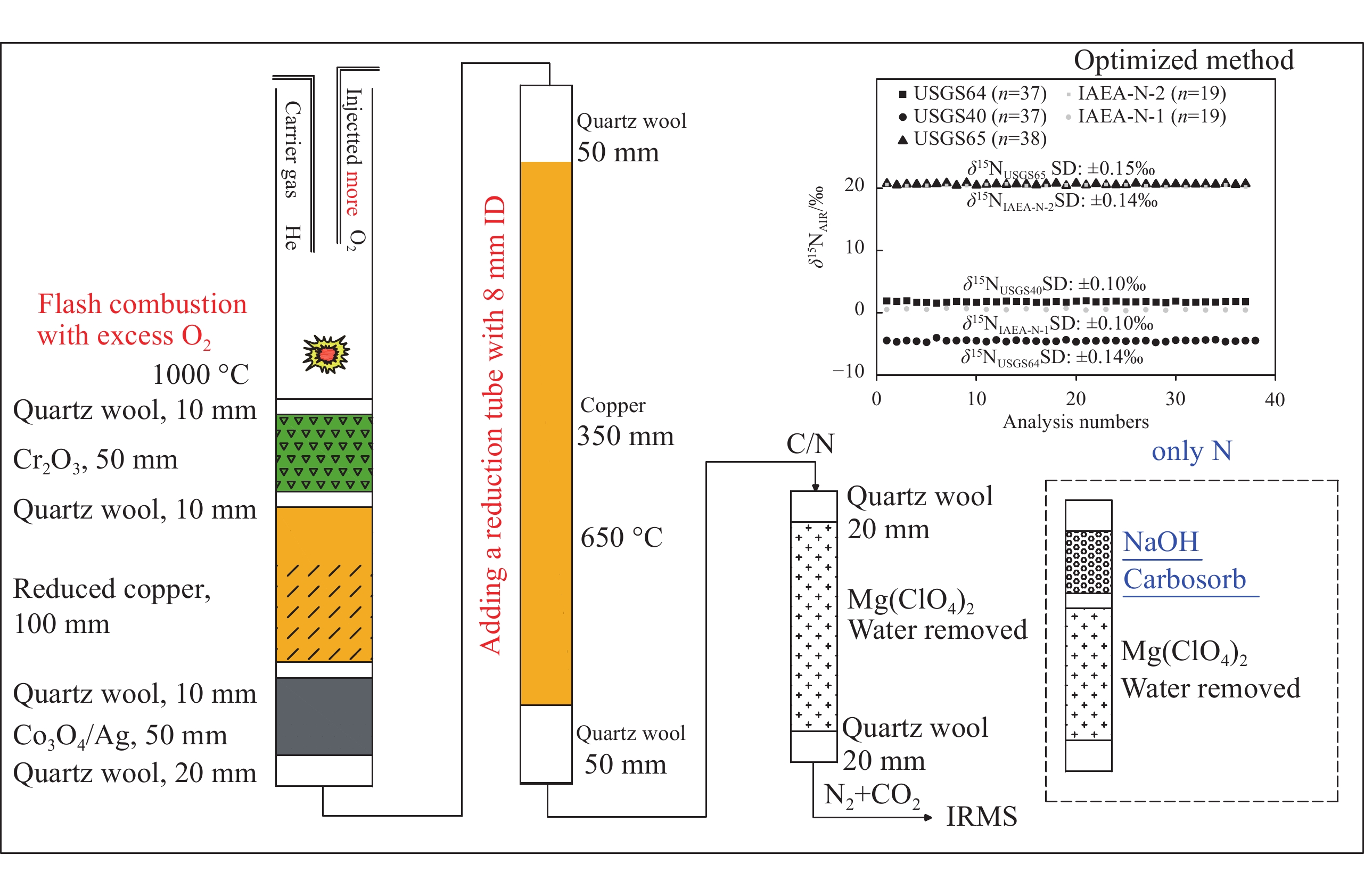为提高氮同位素比值分析的精度,本研究对比了EA Isolink-IRMS系统在不同反应管配置模式和参数条件下氮同位素的测试精度,从燃烧条件、不同反应管配置、洗脱干扰气体等方面对反应条件和参数进行优化,并通过测定一系列标准物质和不同氮含量的海洋沉积物进一步优化该方法。研究表明,不同反应管配置方式、样品燃烧状态和填料消耗情况对氮同位素比值测定具有显著影响。精确的氮同位素分析需确保样品充分燃烧、氮氧化物充分还原、洗脱气流中的CO2和可能存在的杂质气体。本研究结果表明:1)应根据样品类型的不同,采用快速注氧方式,选择合适的注氧量,以确保样品充分燃烧。对于含氮量较高的小尺寸样品(如植株、动物组织和纯化学物质),采用氧气流速175 mL/min,注氧时间3 s;对于大尺寸样品(如含氮量很低的海洋沉积物),氧气流速250 mL/min,注氧时间5 s。2)在现有单反应管配置的基础上,增加小容积还原管可有效确保氮氧化物的充分还原和过量氧气的吸收。采用优化的参数配置,测试的稳定性、重现性和精度显著提高,单独测氮模式下氮同位素的测定精度可优于0.10‰。本方法具有良好的精密度和准确性,可为精确测定样品中氮同位素组成提供参考,对提高相关测试精度具有重要意义。