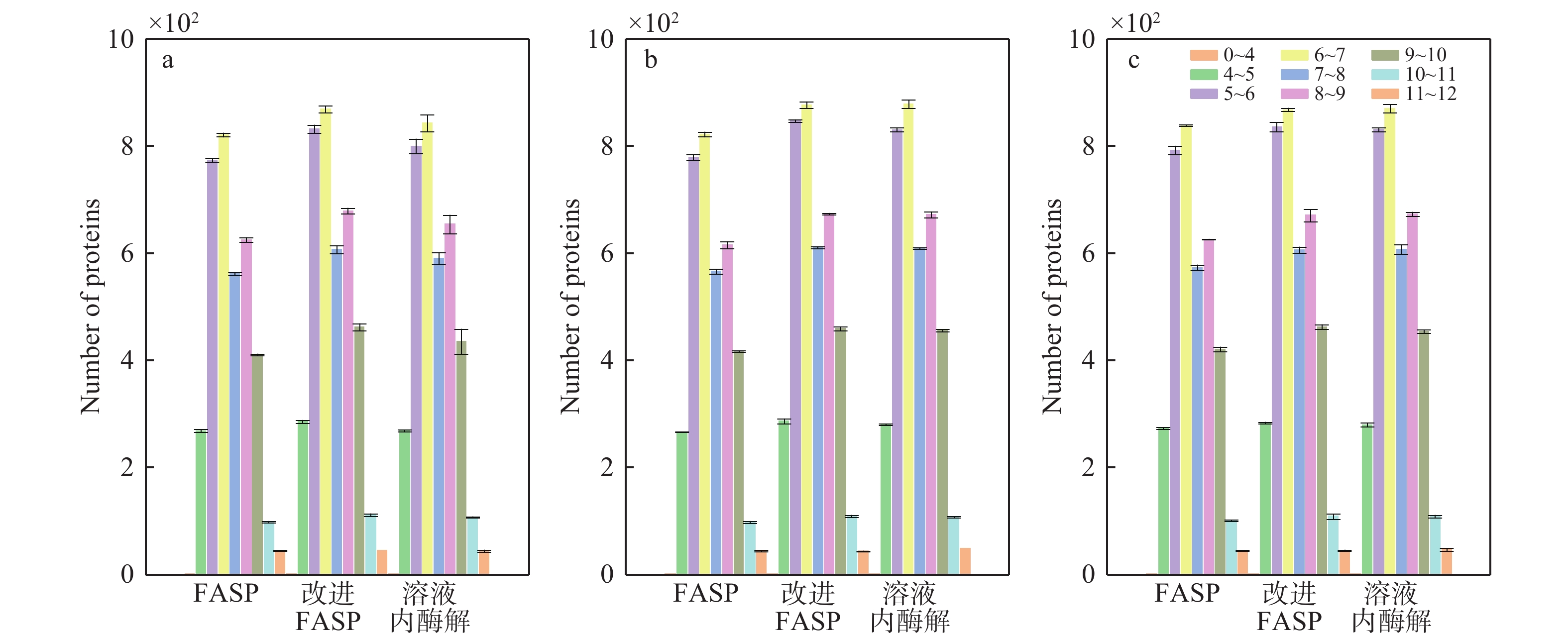 图 10  不同裂解液中3种样品前处理方法鉴定蛋白等电点分布