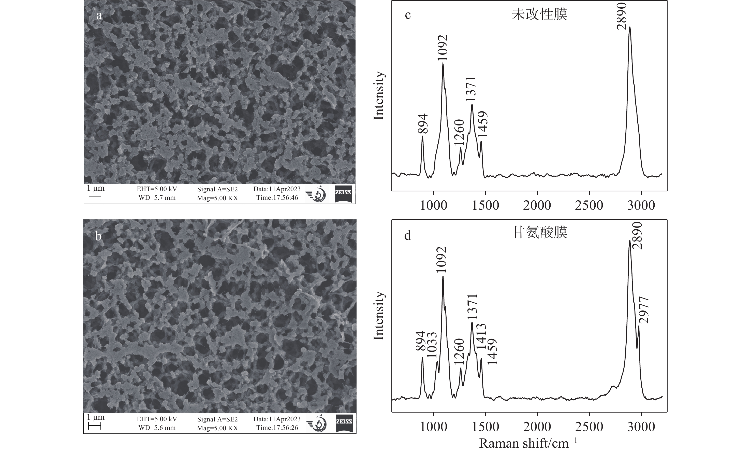 • 为验证膜表面已成功接枝氨基酸基团,本研究采用激光共聚焦拉曼光谱仪检测膜表面的官能团结构,同时在电镜下观察膜表面的结构变化。改性前后膜表面在电镜下的结构特征分别示于图3a3b,未改性和甘氨酸改性后2种RC膜表面的拉曼光谱特征分别示于图3c3d。结果表明,改性后RC超滤膜表面未见明显的结构变化,RC膜孔径大小未发生明显变化,拉曼光谱新增1 033 cm−1处C−N含氮官能团和1 413 cm−1处−COO−含氧官能团。