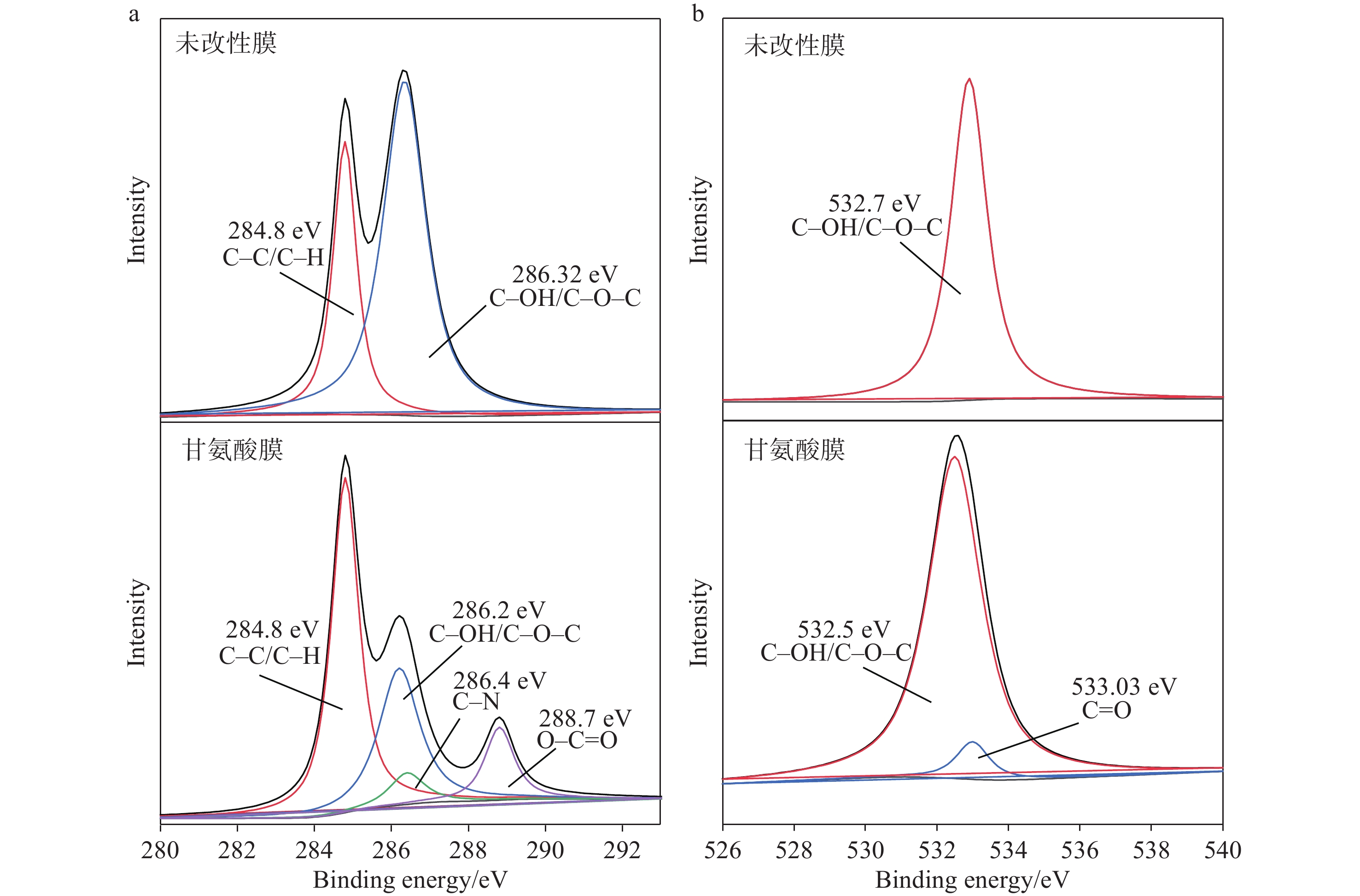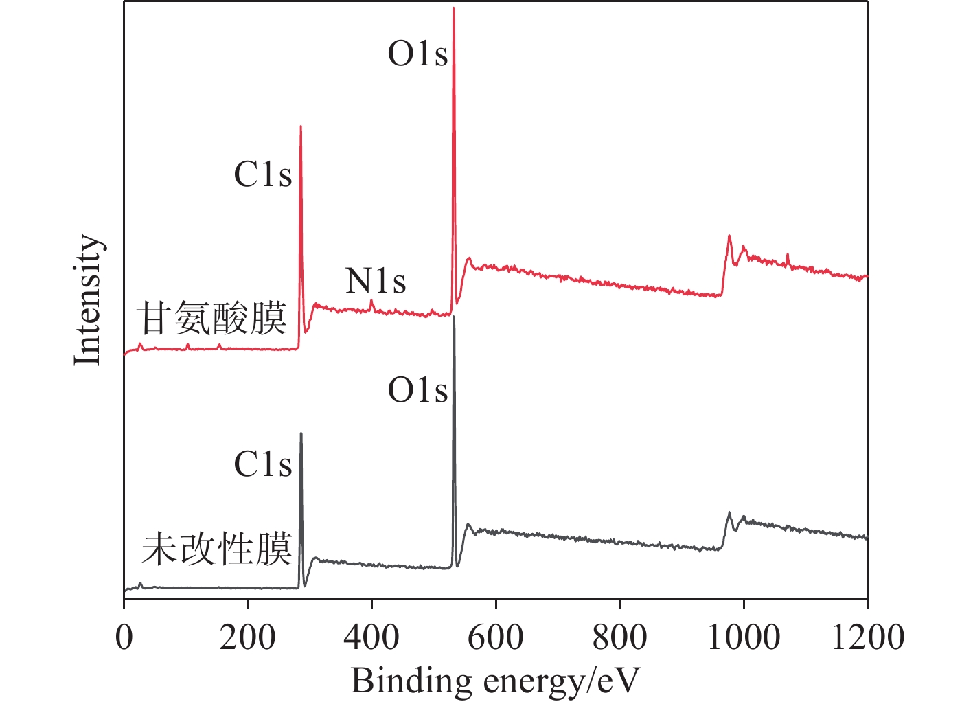 • 利用XPS能谱技术进一步探究改性后RC膜表面的氮元素含量。未改性膜和甘氨酸改性膜的XPS全谱示于图4,均主要含有C、O骨架元素。同时,在甘氨酸改性膜的XPS全谱峰图中,除主要的C、O元素外,还存在微量的N元素,这是由甘氨酸分子NH2基团引入的,表明甘氨酸分子被连接到RC膜表面。
